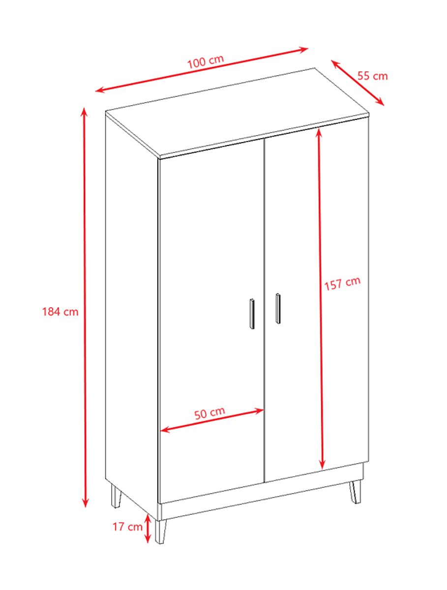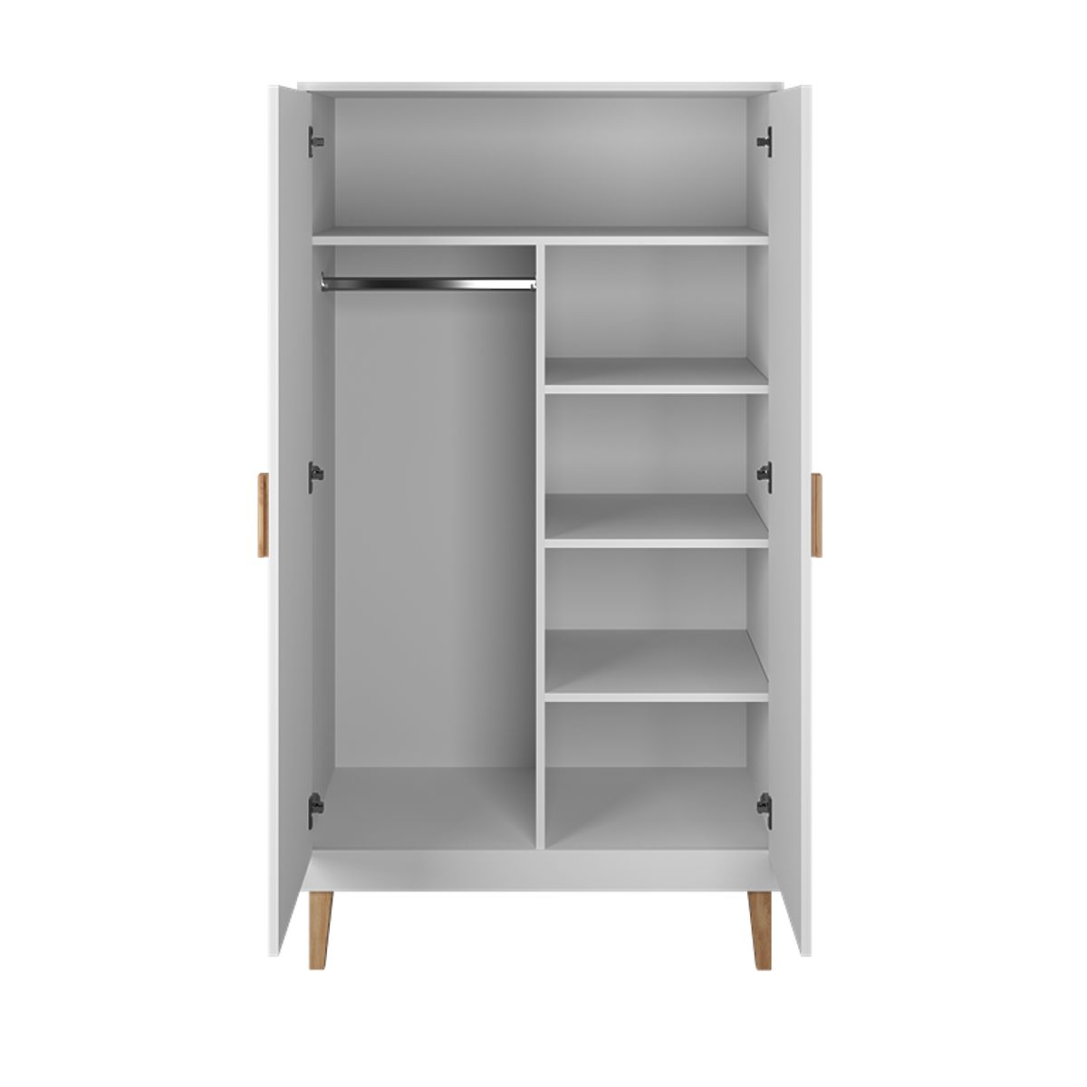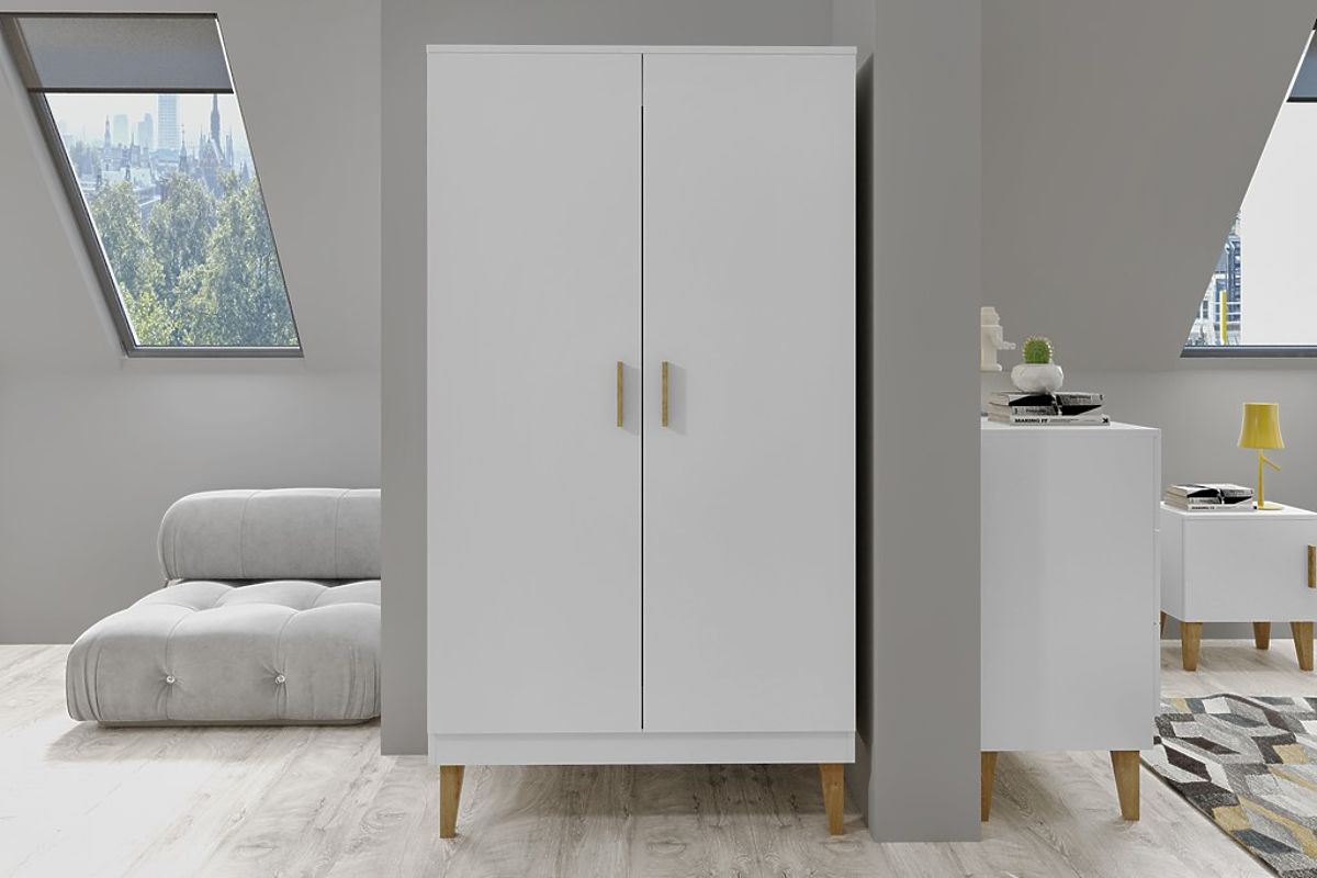 The snow-white two-door wardrobe KUBI is made from high-quality furniture board. The legs made of solid oak perfectly complement the modern Scandinavian style, which can be easily matched with any interior.