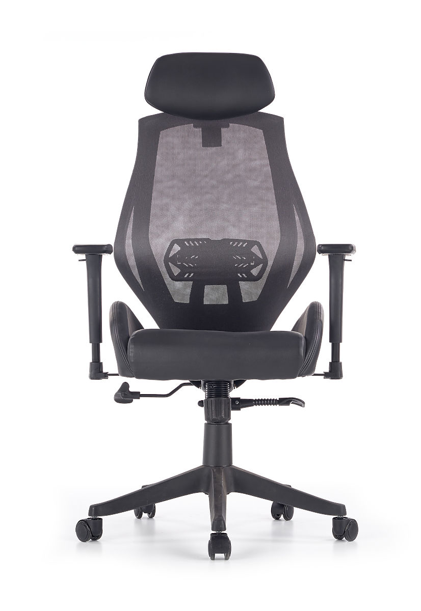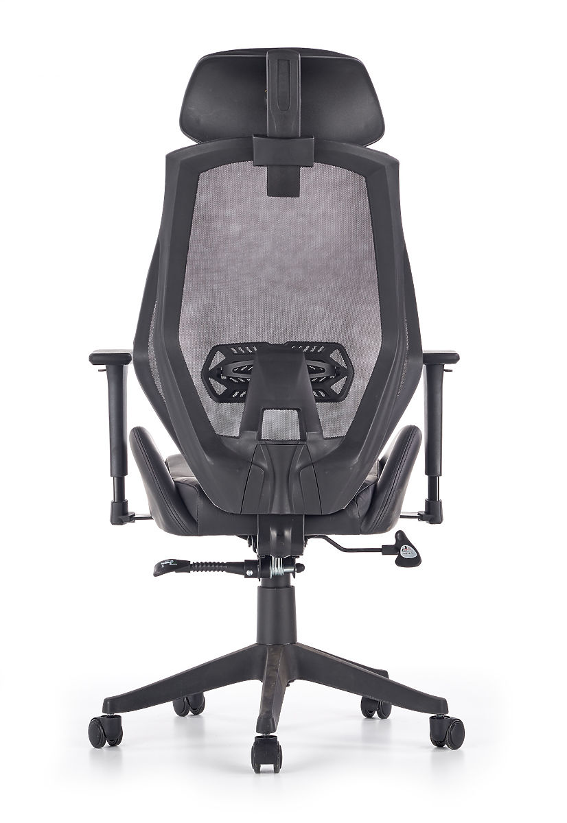 The Multiblock mechanism offers a rocking feature, with adjustable tension. The ergonomically shaped backrest and headrest are covered with breathable mesh, and the seat is upholstered in black eco-leather. The backrest also includes a lumbar support for healthy seating, along with adjustable armrests. The frame is made of sturdy plastic.
