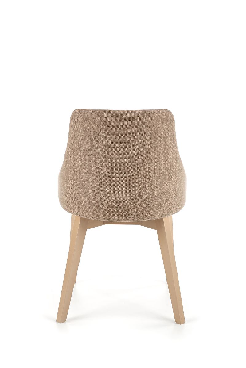 The chair's frame is made from solid beech wood in a sonoma oak finish. The seat and backrest are upholstered in a comfortable brown fabric.