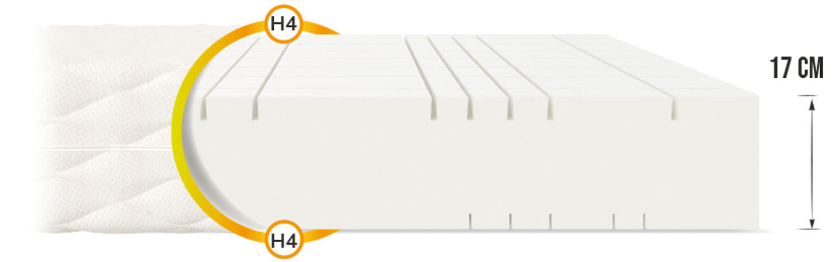 Are you looking for a universal foam mattress for the whole family? If so, the GOYA with a height of 17 cm will definitely meet your requirements. Its construction is simple, as it is cut from a single piece of foam, yet it has many advantages. The double-sided mattress is divided into 7 zones thanks to a series of longitudinal and transverse cuts. This significantly increases plasticity, providing excellent spinal support, ensuring you wake up refreshed and full of energy. The GOYA mattress offers a very good price-performance ratio. It is flexible and very durable.