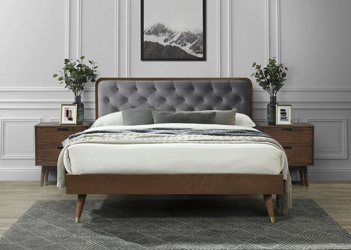 The CASSIDY bed in retro style with an upholstered headboard and a combination of split fabric and wood is an original piece of furniture for your bedroom. The retro design will give the bedroom a distinctive look and unique character. The dimensions for the 160 x 200 cm mattress mean that this bed is spacious and comfortable enough for you and your partner.