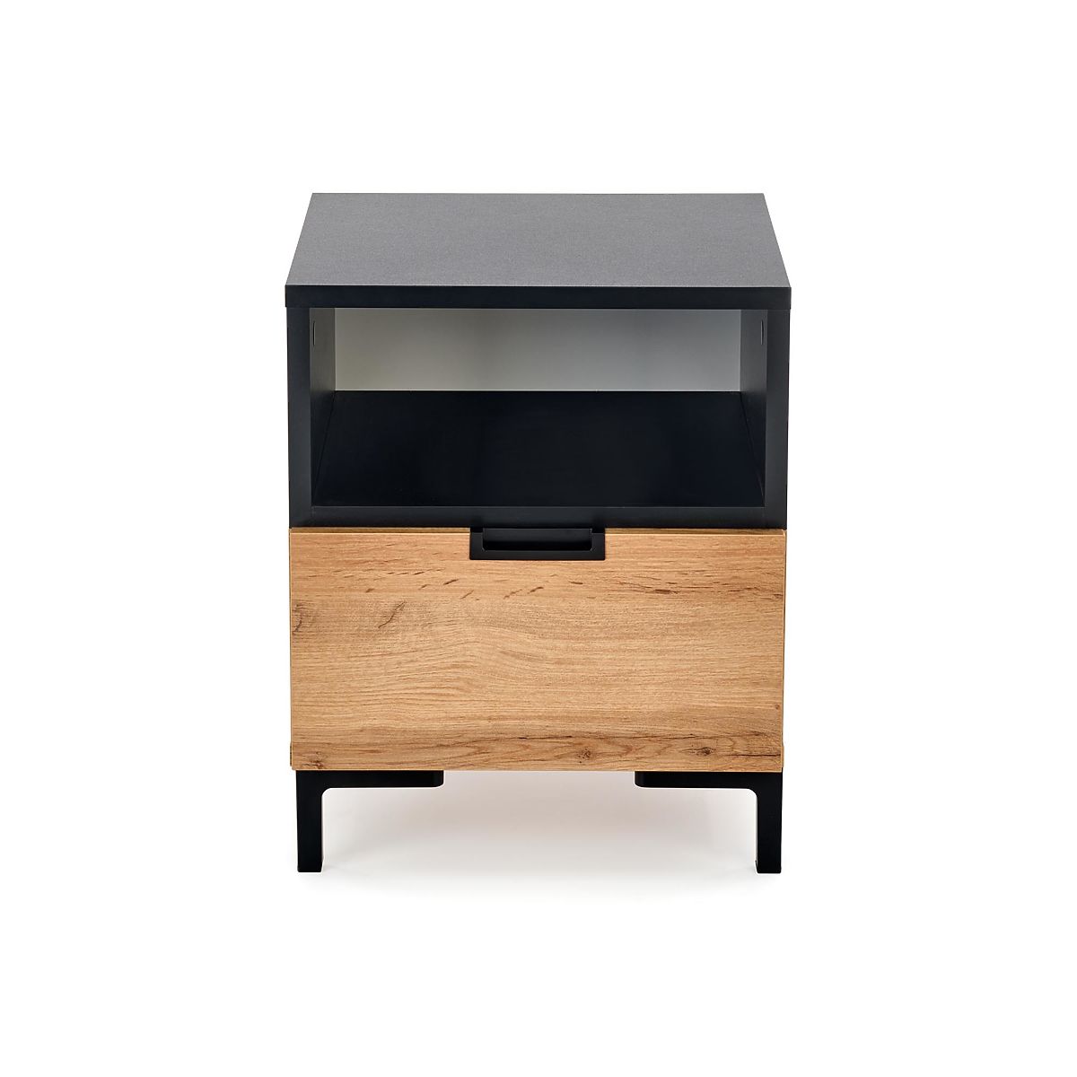 The Wotan bedside table with drawer combines the unique elegance of black with the warm tone of Wotan oak, creating a stylish and functional addition to your bedroom. Its modern design with contrasting elements of Wotan oak impresses and at the same time blends easily with different interiors.