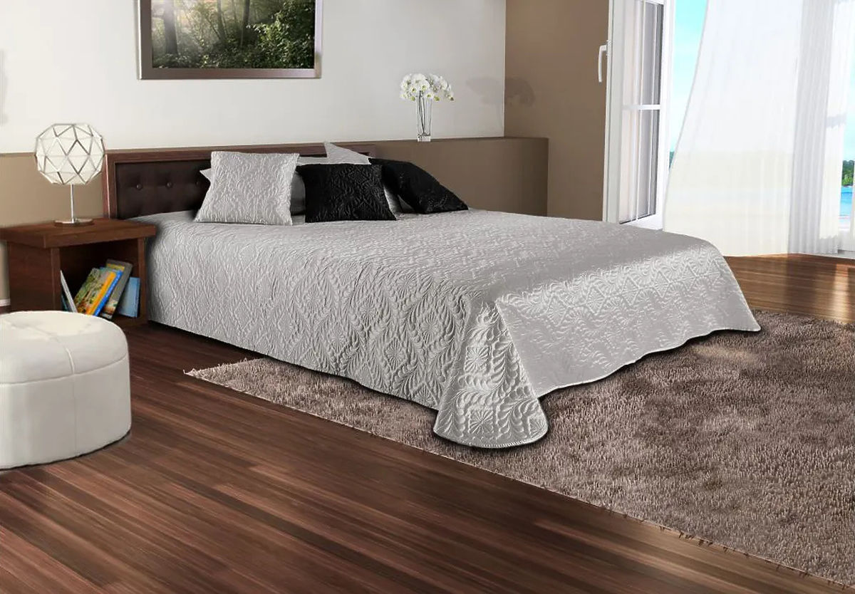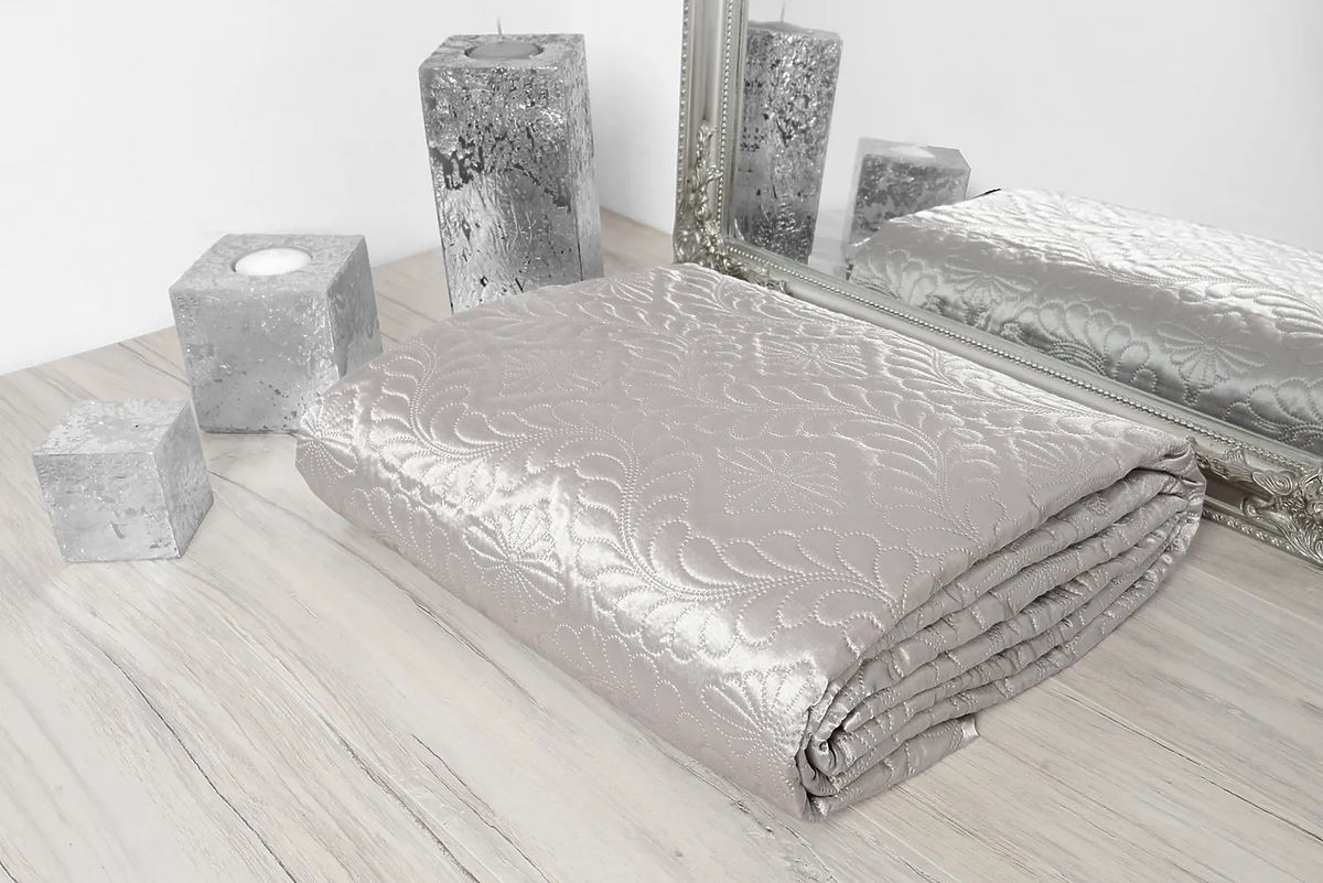 Adorn your bed with an elegant and unique satin bedspread in a silver gray color. The package also includes 2 pillow covers. Its uniqueness is owed to the sophisticated and elegant design created using ultrasonic technology, ensuring a perfectly embossed pattern.