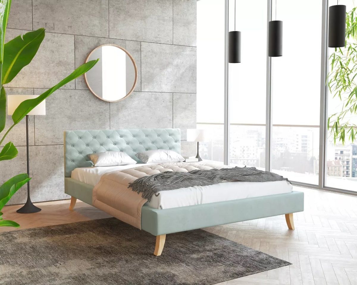 The upholstery material of the bed is mint velour fabric Trinity. It features a fine texture and high resistance to sunlight. It is soft, fluffy, and pleasant to the touch. It is also very resistant to abrasion and pilling. You will be impressed by its modern look and the decorative stitching on the headboard.