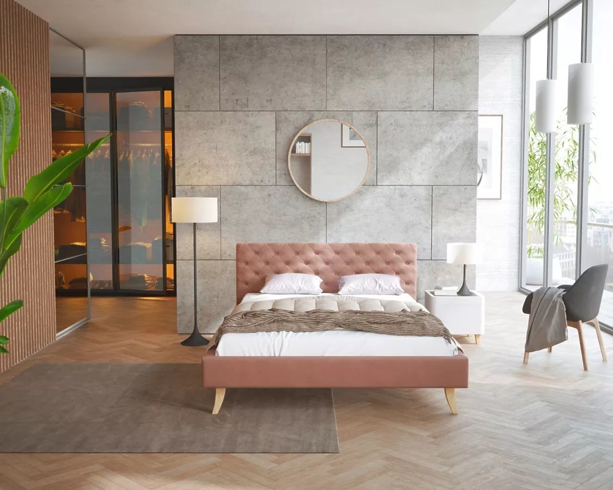 The upholstery material of the bed is old pink velour fabric Trinity. It features a fine structure and high resistance to sunlight. It is soft, fluffy, and pleasant to the touch. It is also very resistant to abrasion and pilling. You will be impressed by its modern look and decorative stitching on the headboard.