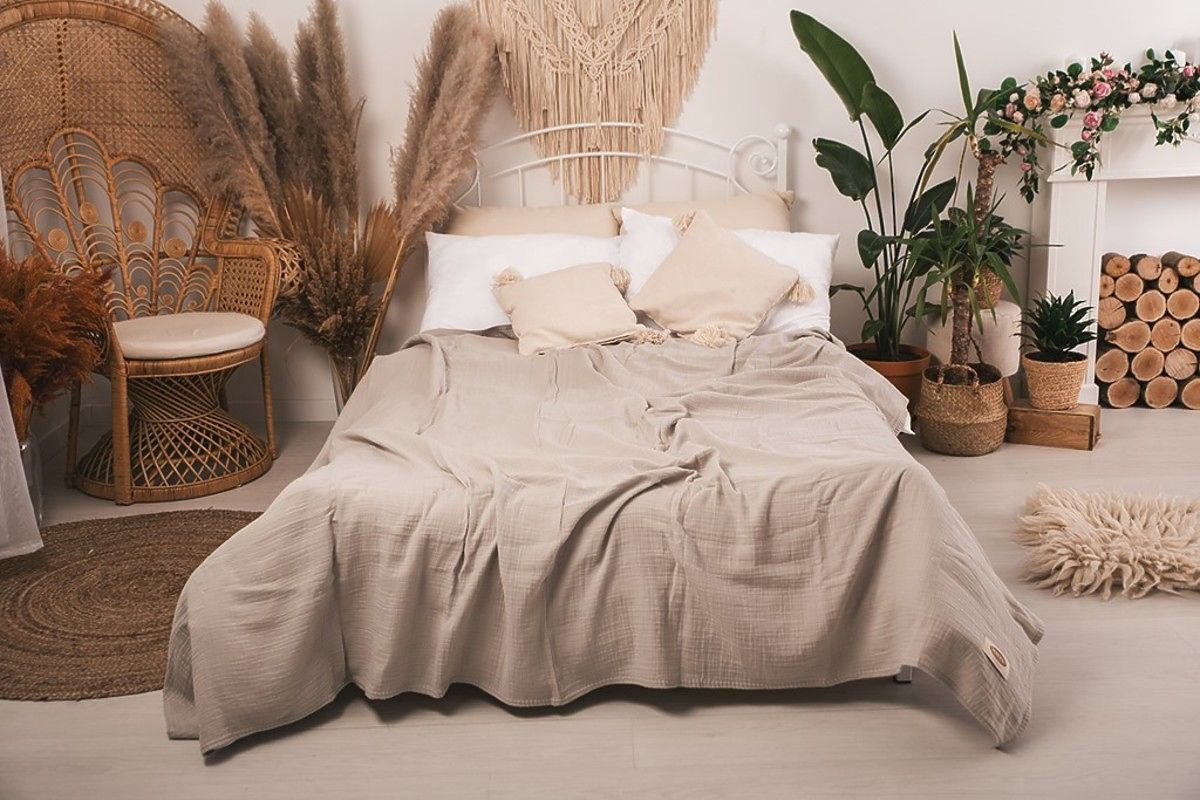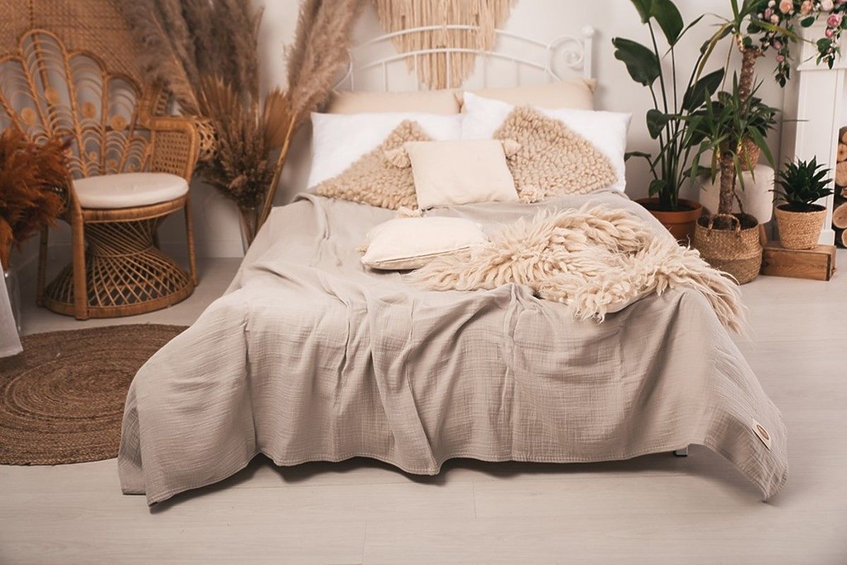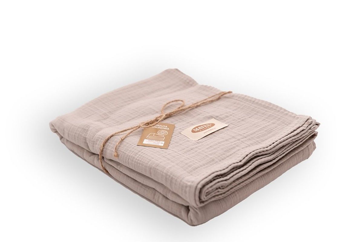Muslin bedspread 240x210 cm. It is light, pleasant and soft to the touch. It has excellent breathability and the ability to regulate temperature. It does not require ironing, always has an aesthetic effect and gives the bedroom a cozy look.