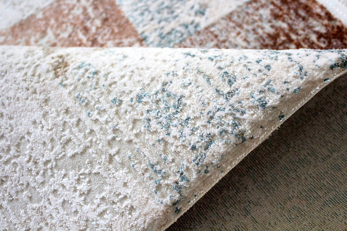 The light beige background of the carpet, complemented by scattered tones of brick and azure, creates a harmonious whole that will add a touch of elegance to your interior.