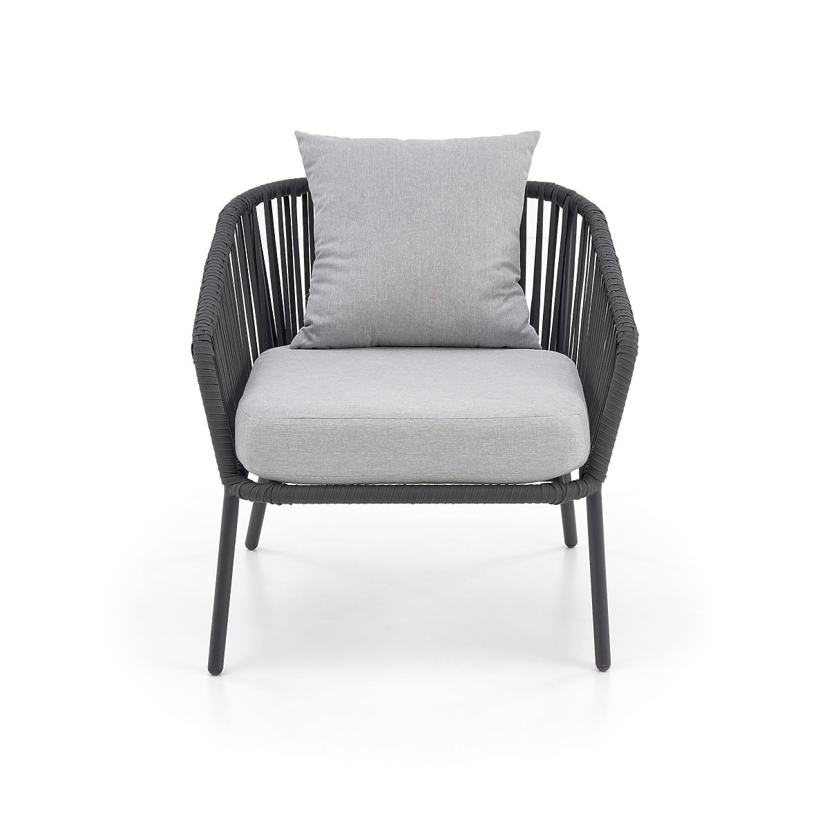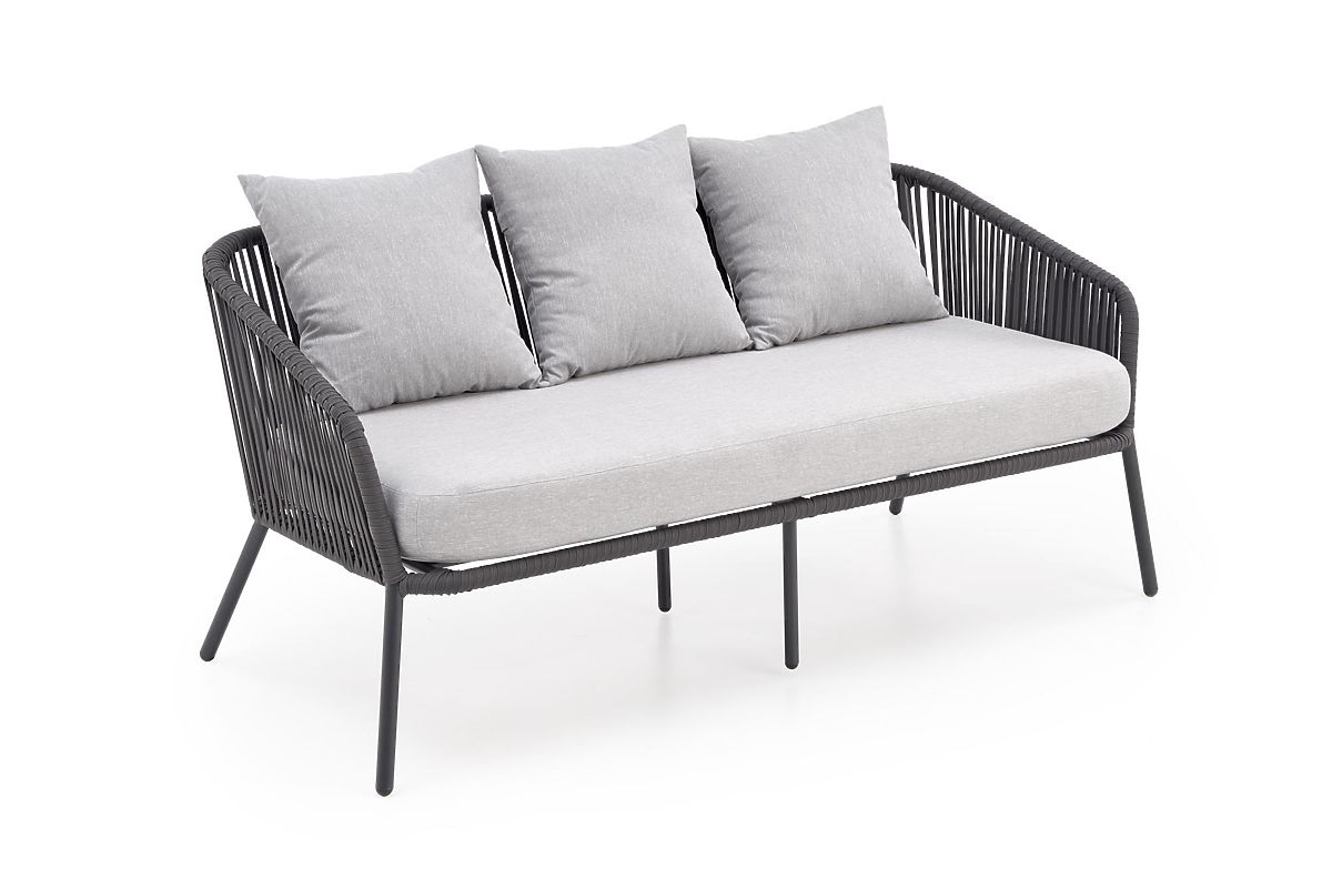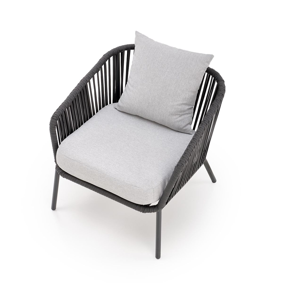 This patio furniture is made of powder-coated aluminum combined with ropes in a dark ash color, which adds a twist to the overall design as well as robustness. Aluminum is characterized by high resistance to weather effects and ensures a long service life of the furniture.