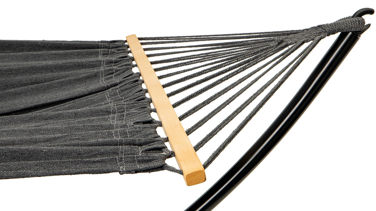 The hammock is made of a durable material that perfectly adapts to the body. Wooden bars, through which the fastening cords are threaded, ensure that the lying area is properly stretched and does not twist.