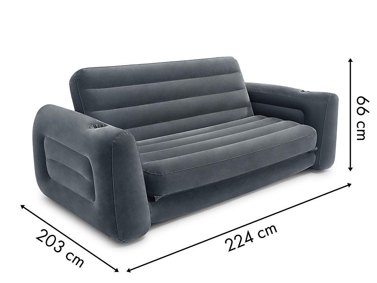 The INTEX velour sofa, with dimensions of 224 x 203 x 66 cm, is ideal for 2 people. Made from durable PVC material, topped with a pleasant-to-touch waterproof velour. Entirely in a pleasant gray color that fits into any interior. The Boston valve allows you to deflate the air within a minute, fold it, and store it in a closet.