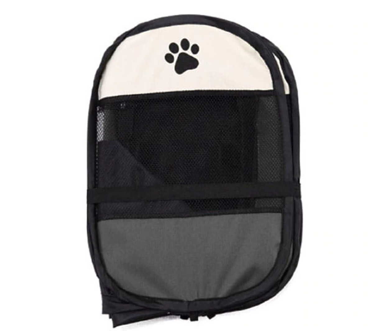 One side of the playpen features an entrance, allowing the animal to freely enter and exit. The entrance is made of mesh and closes with a zipper, which also has a Velcro strap, allowing it to be left open.