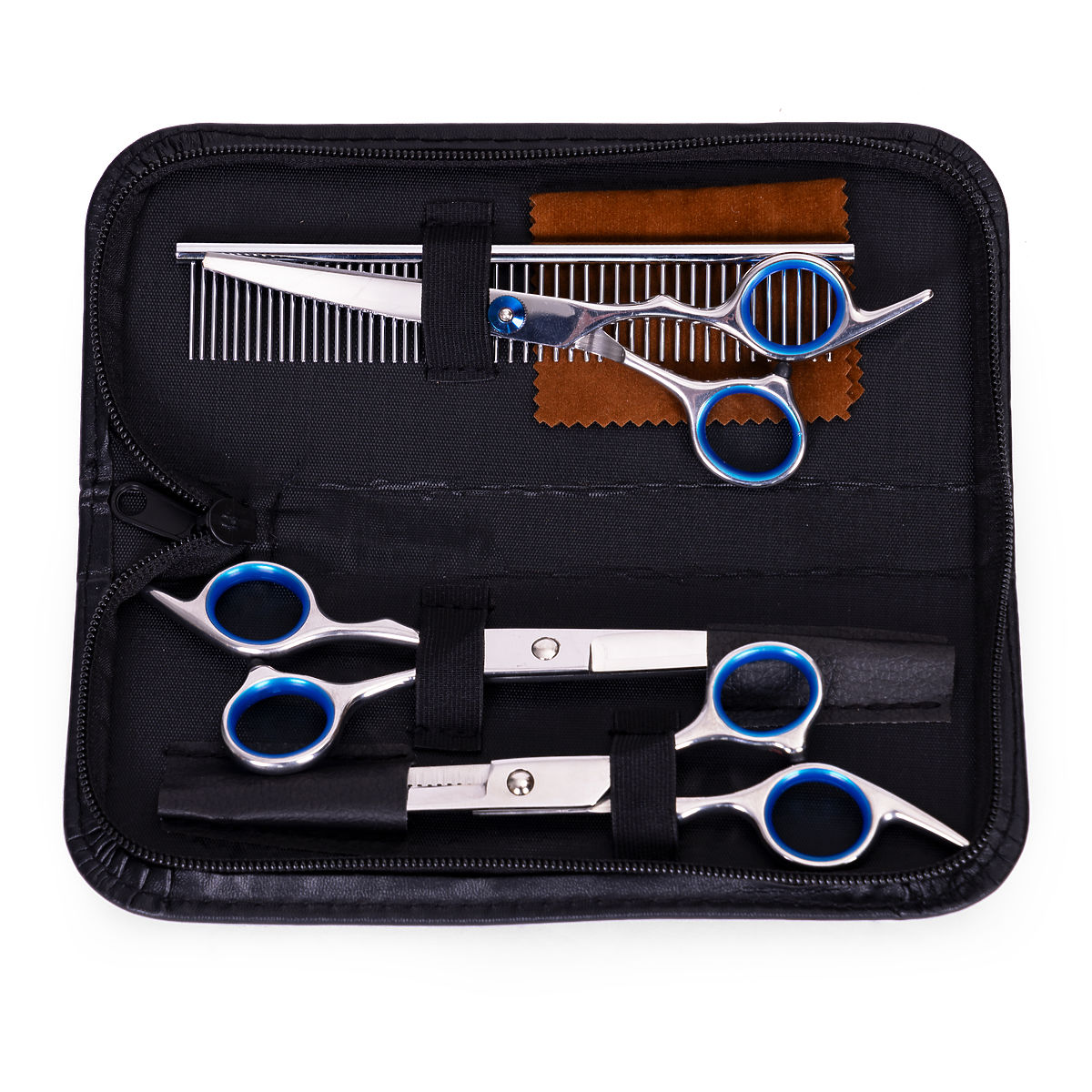 The scissor set was created with safe trimming and care for dogs and cats in mind, ensuring precision and comfort for both owners and our pets. The set includes three different types of scissors that can be adapted to various grooming needs. Additionally, the grooming set includes a practical comb, suitable for both smooth and tangled fur, all packed in a small eco-leather case.