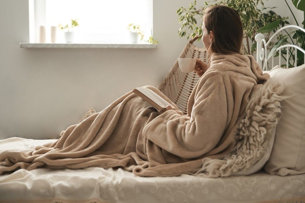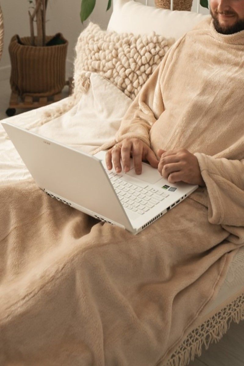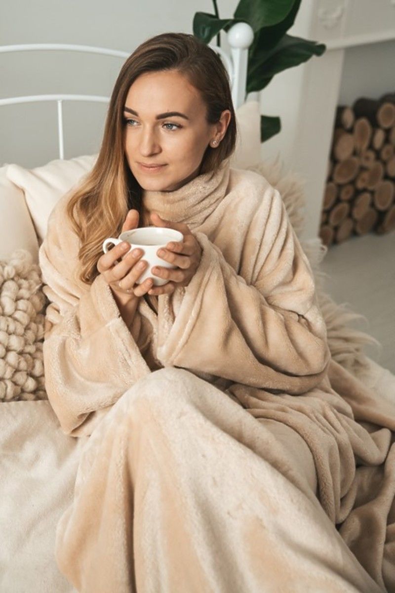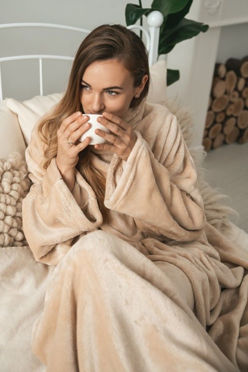 A warm embrace of luxury with practical sleeves in a cozy beige color: