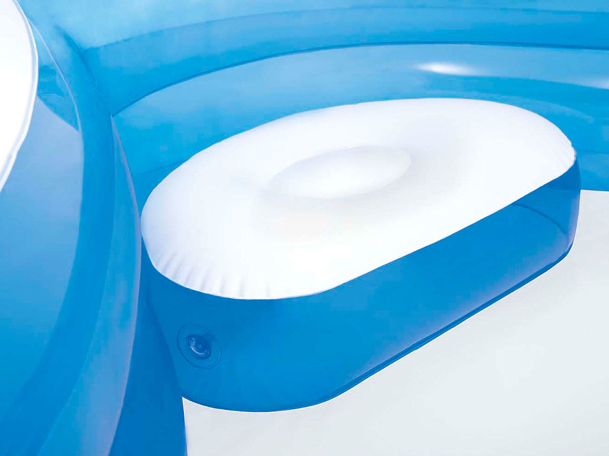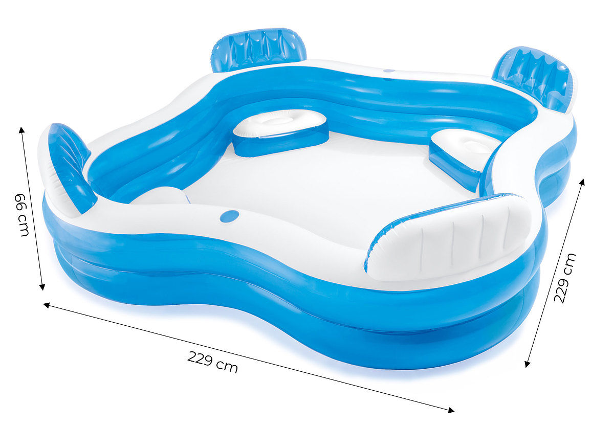 The pool is made of PVC material, has a pleasant color scheme, and seats with backrests in each of the four corners - an ideal choice for relaxation for you and your family.