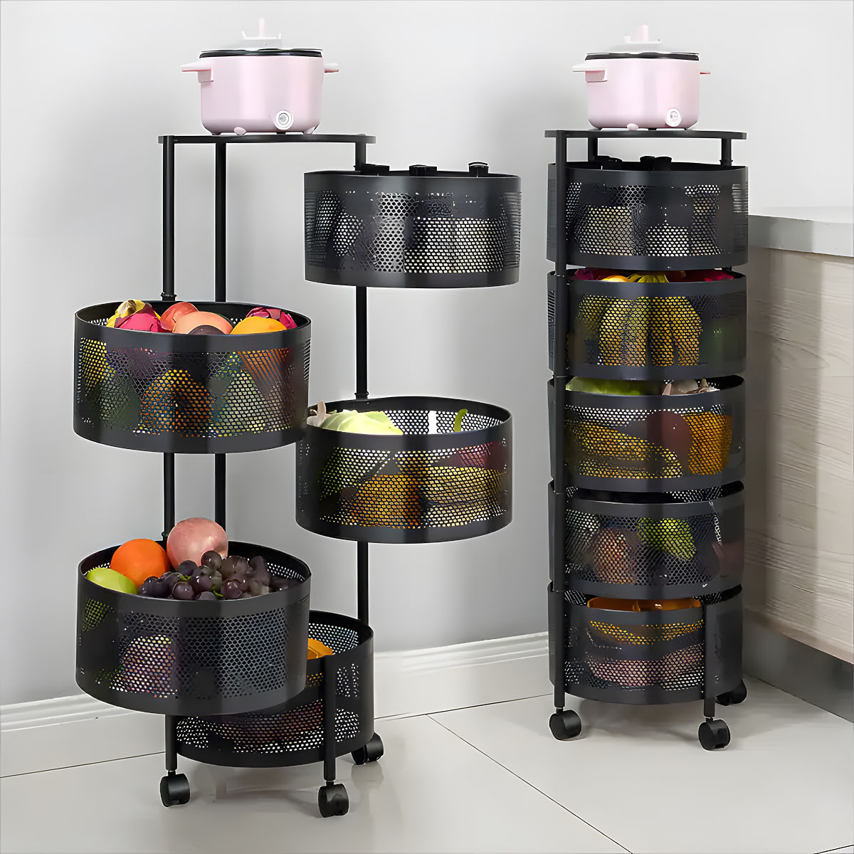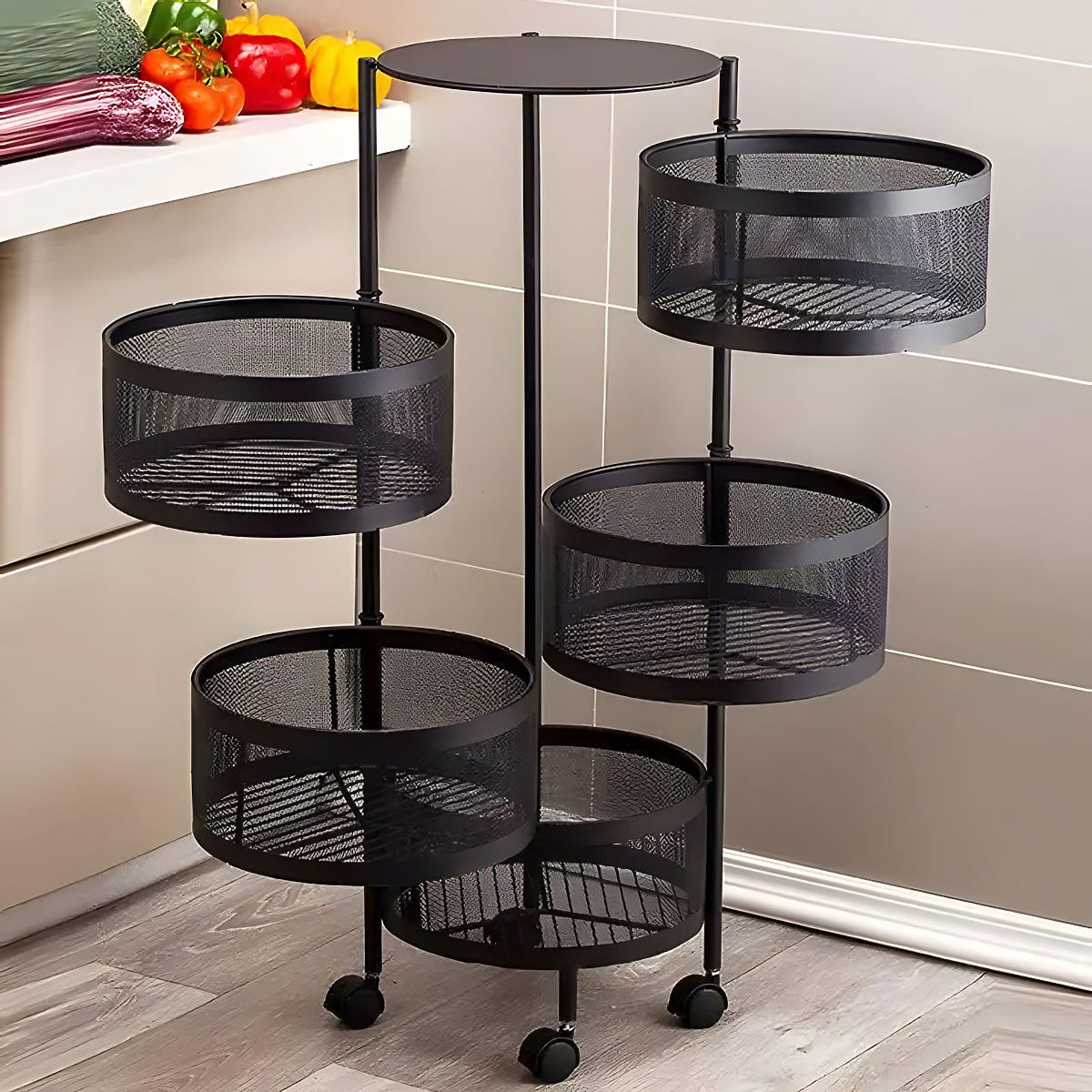 Metal kitchen organizer with 5 rotating shelves and wheels for easy movement. .. more