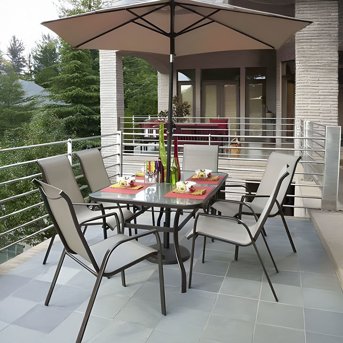 Tempered glass garden table with parasol hole and stable steel frame. .. more