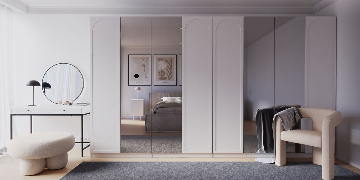 Customizable wardrobe with decorative arches and a practical mirror. .. more