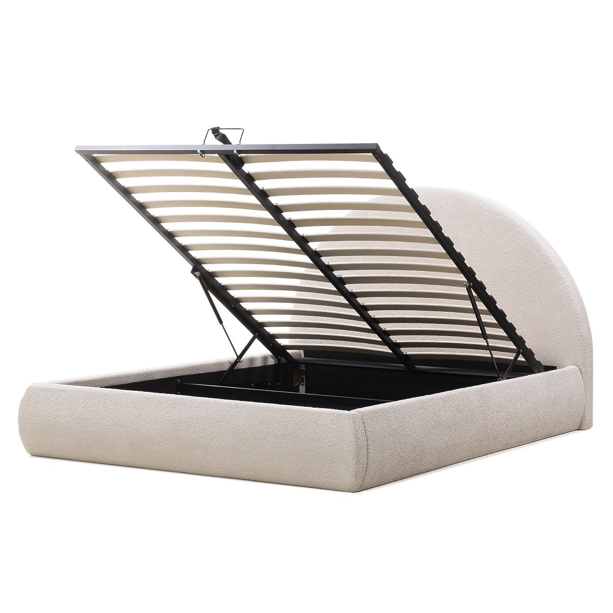 Elegant beige bed with rounded headboard and practical storage. .. more