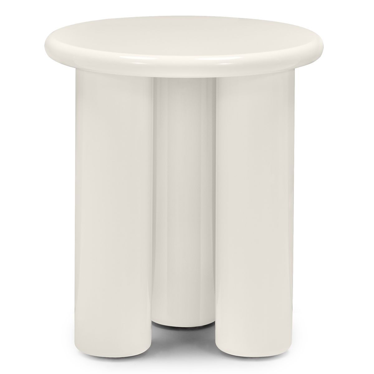 Cream glossy side table with rounded edges and three sturdy legs. .. more