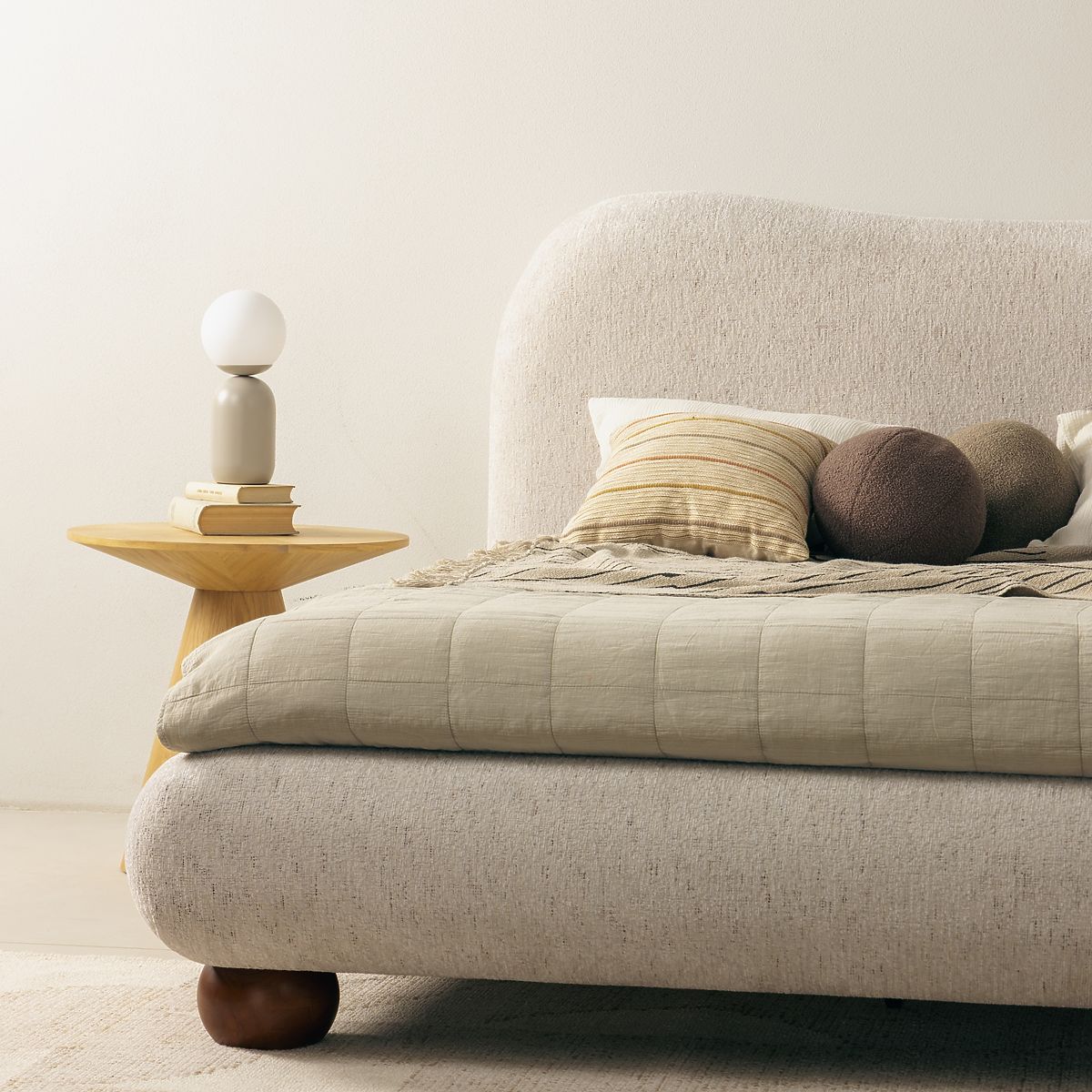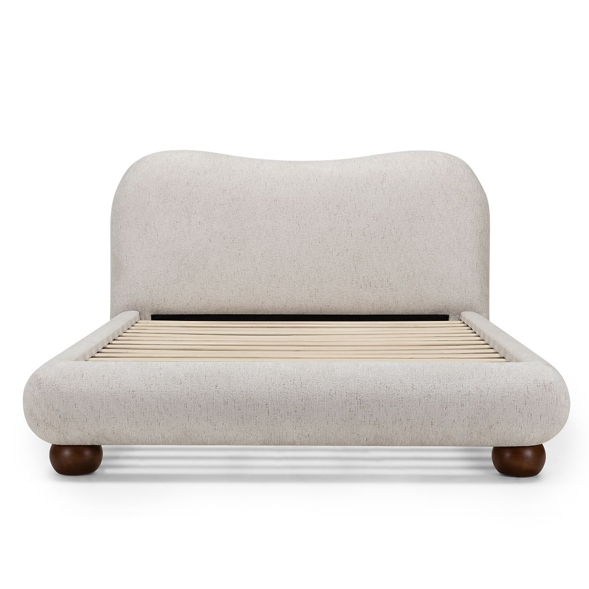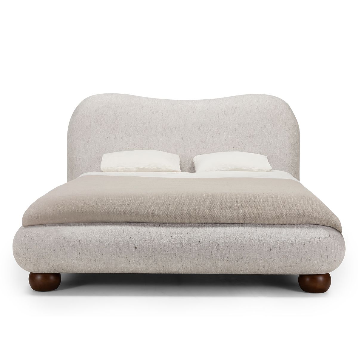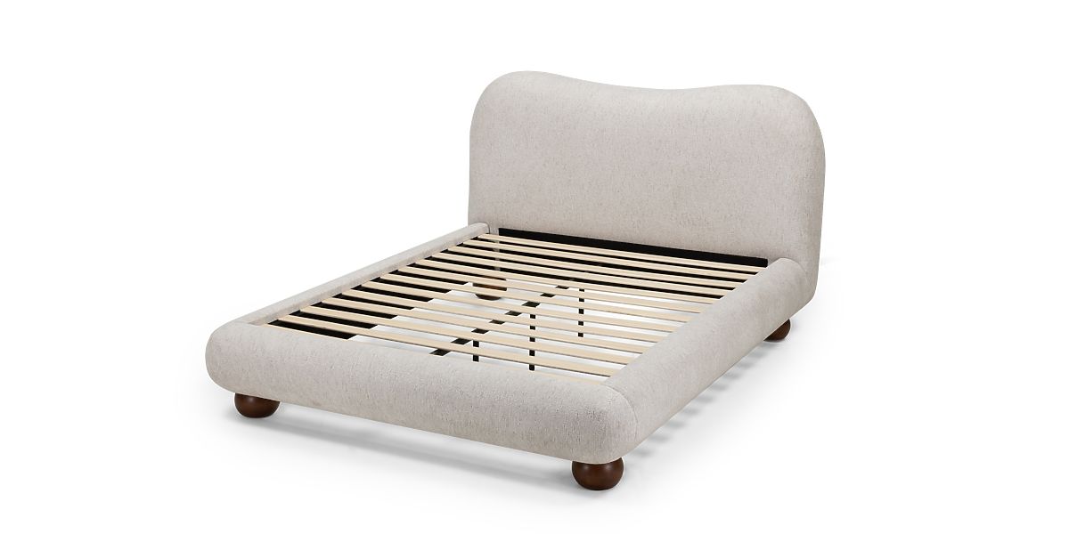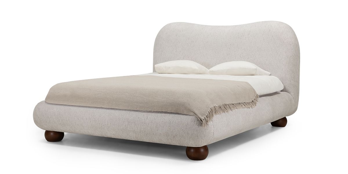 Bowee bed offers elegance and comfort with light beige upholstery and round legs. .. more