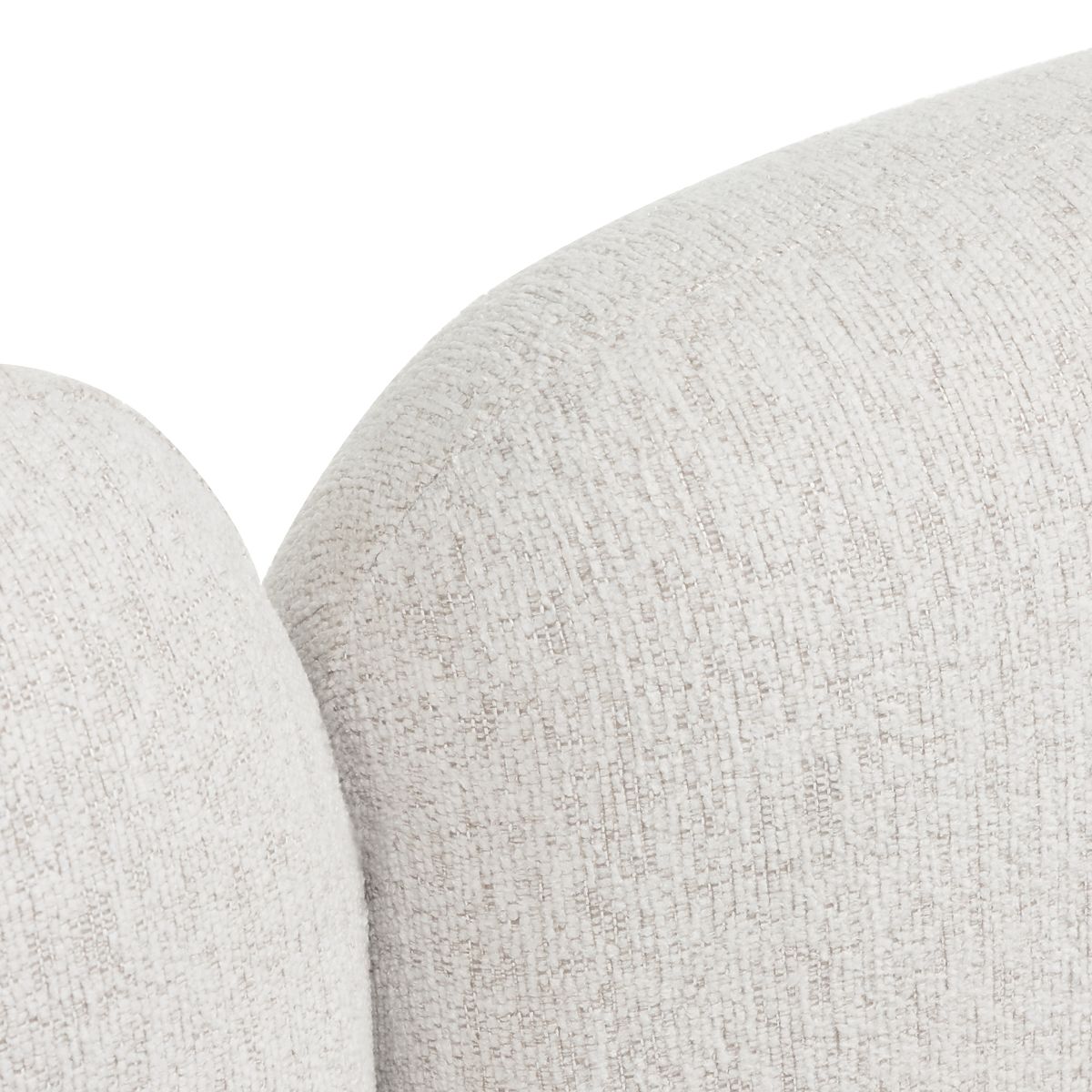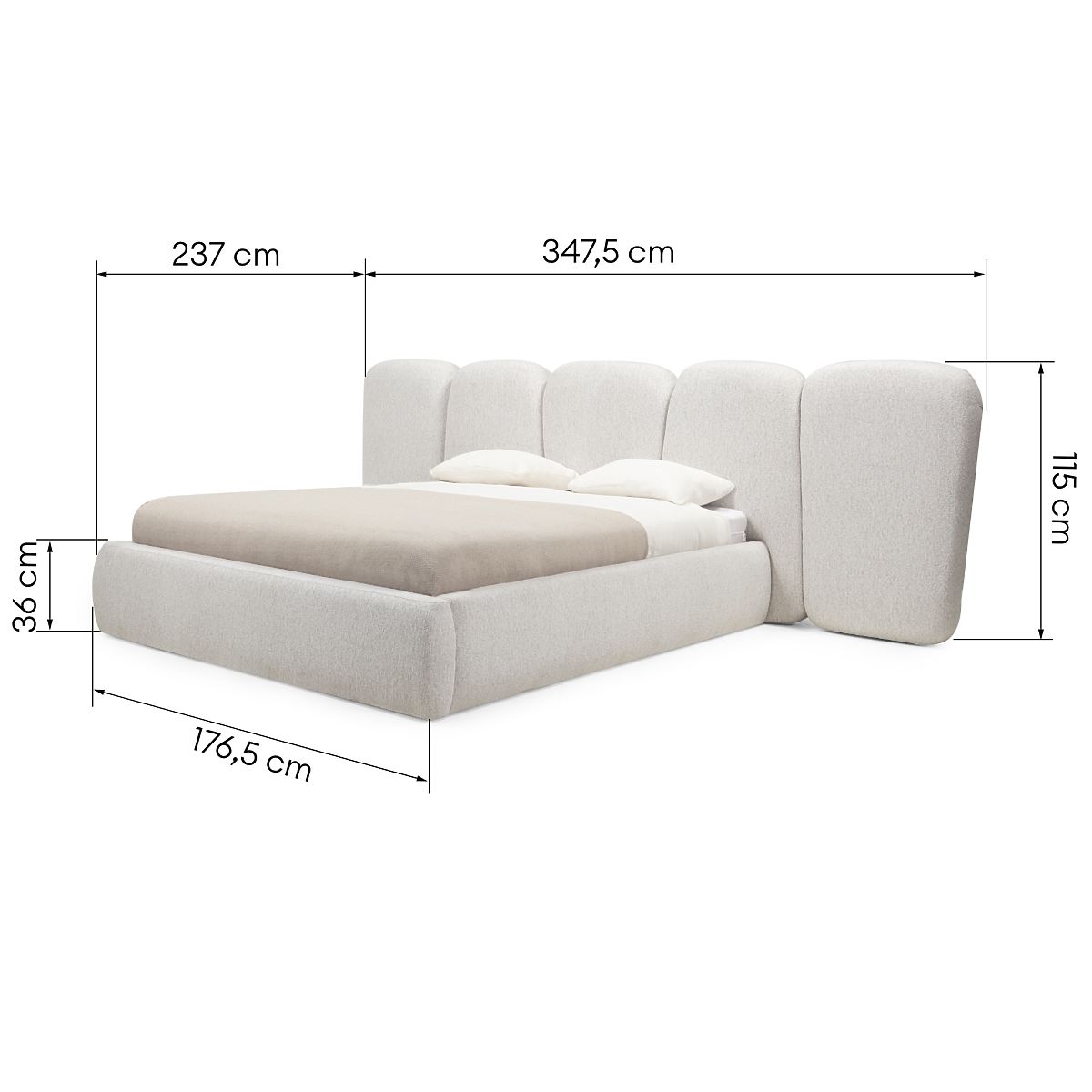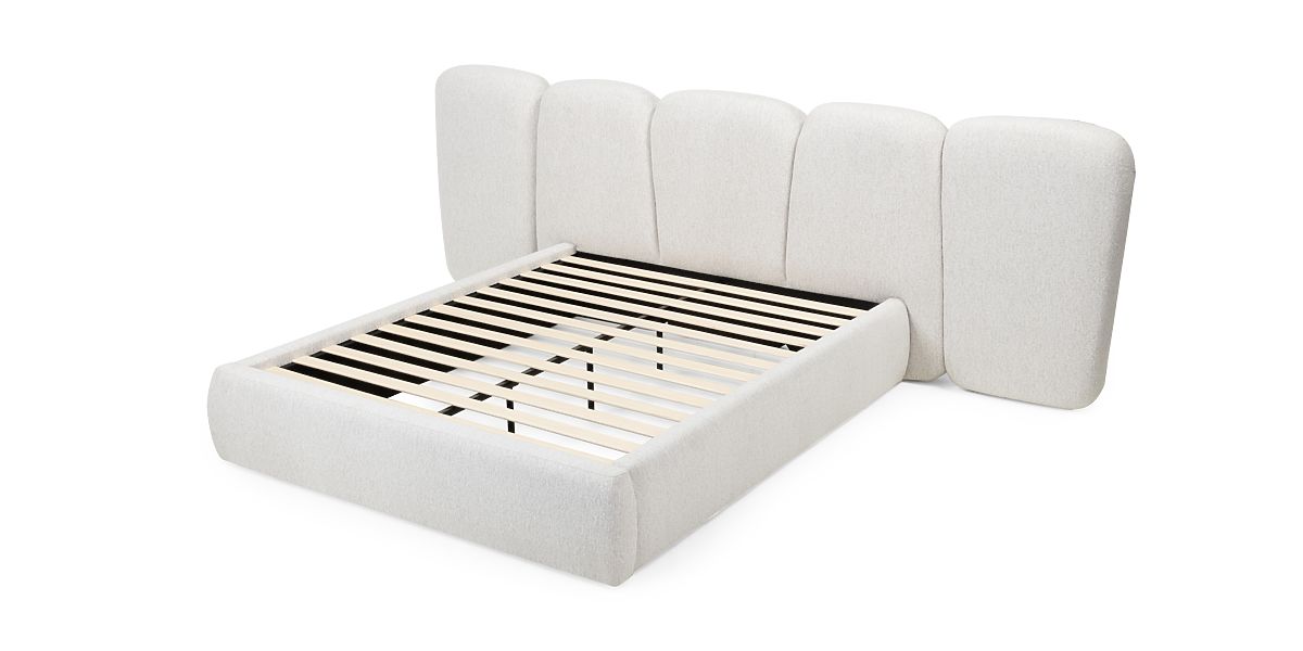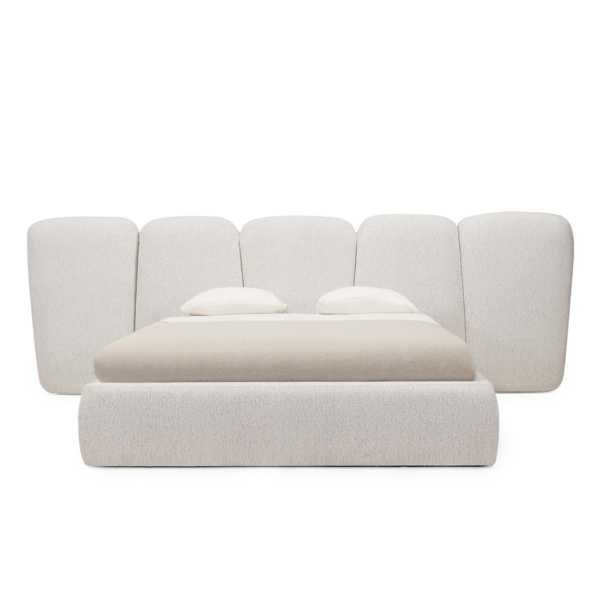 Light beige upholstered bed with a wide, rounded headboard. .. more