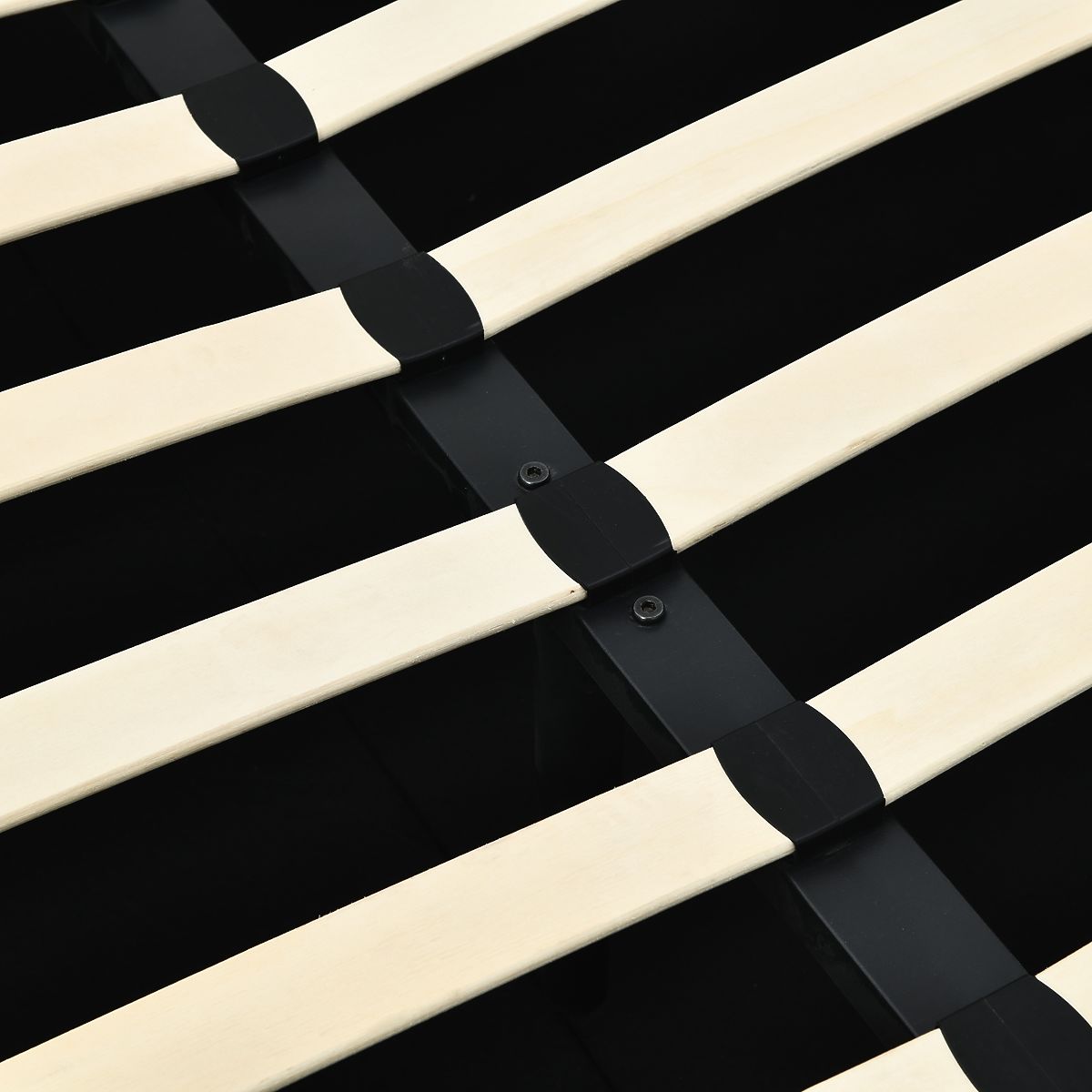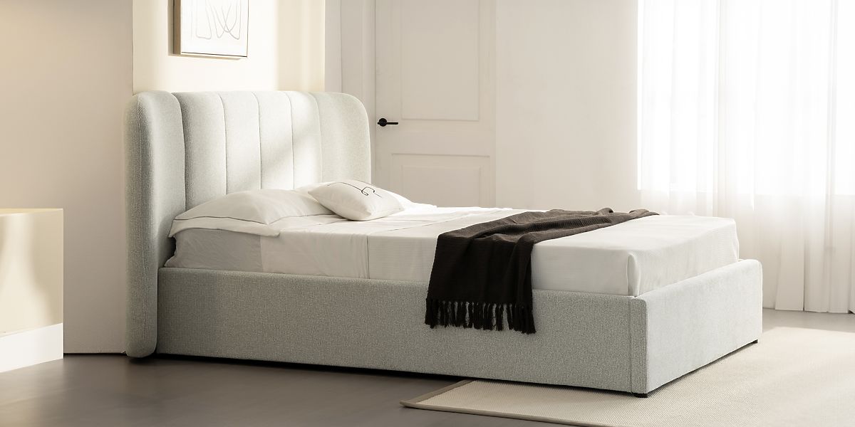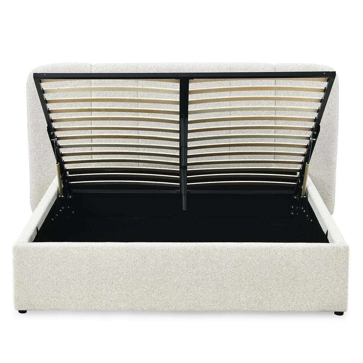 Light beige upholstered bed with storage and slatted frame. .. more