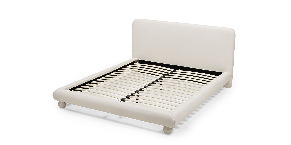 Light beige upholstered bed with ball-shaped legs and slatted base. .. more