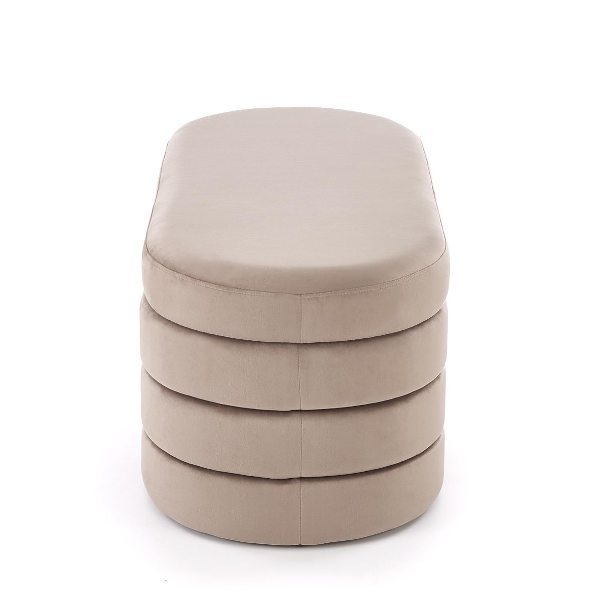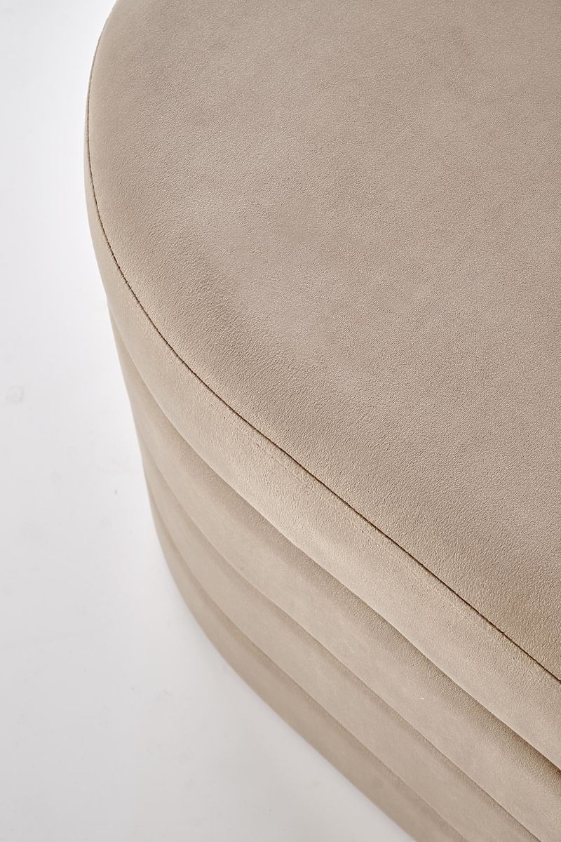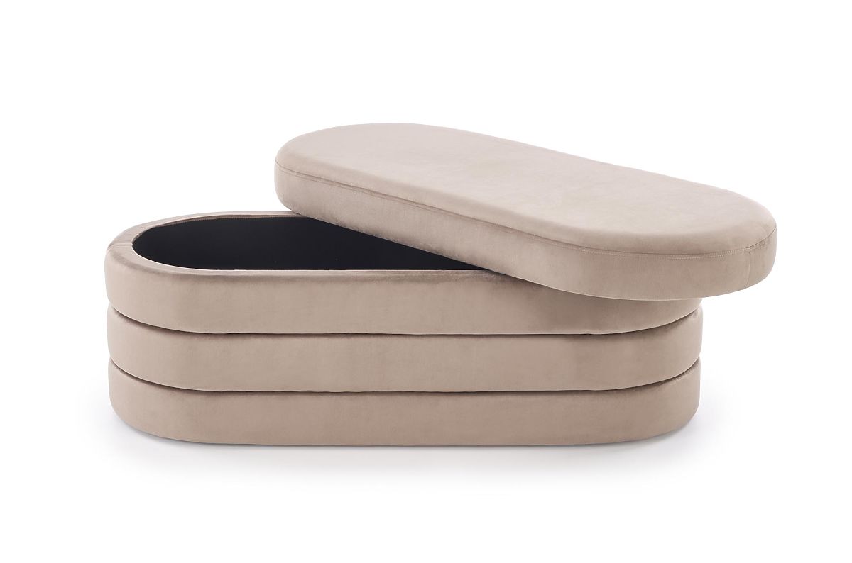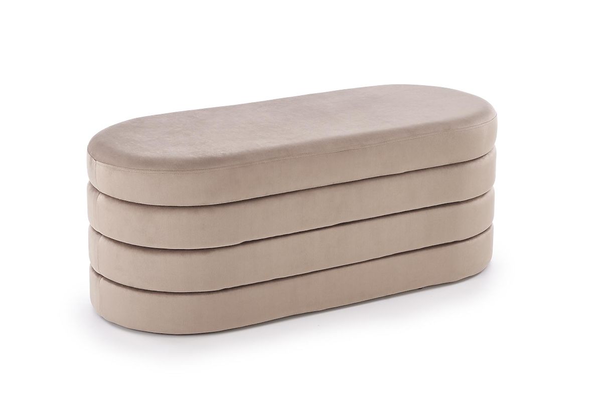 Beige velvet bench with storage space. .. more