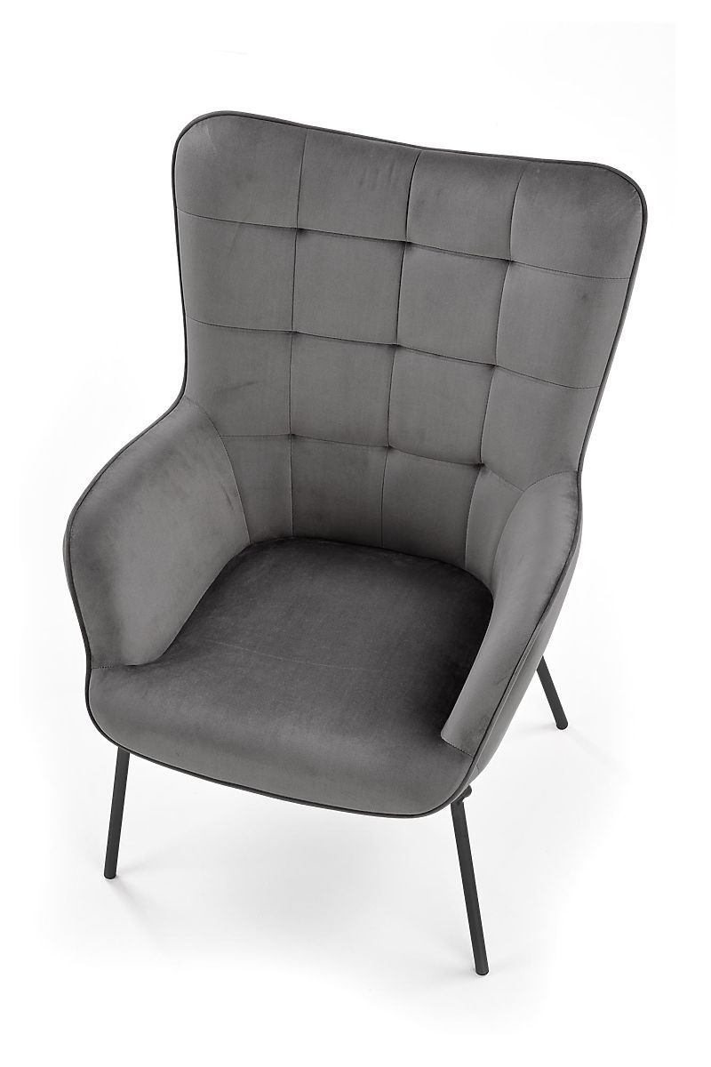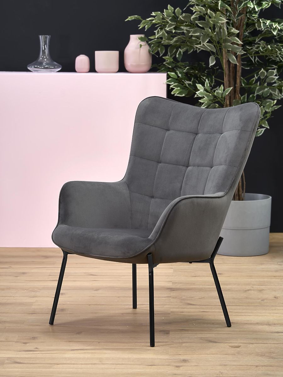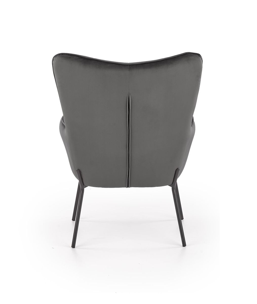 Relaxation chair with gray upholstery and black legs. .. more
