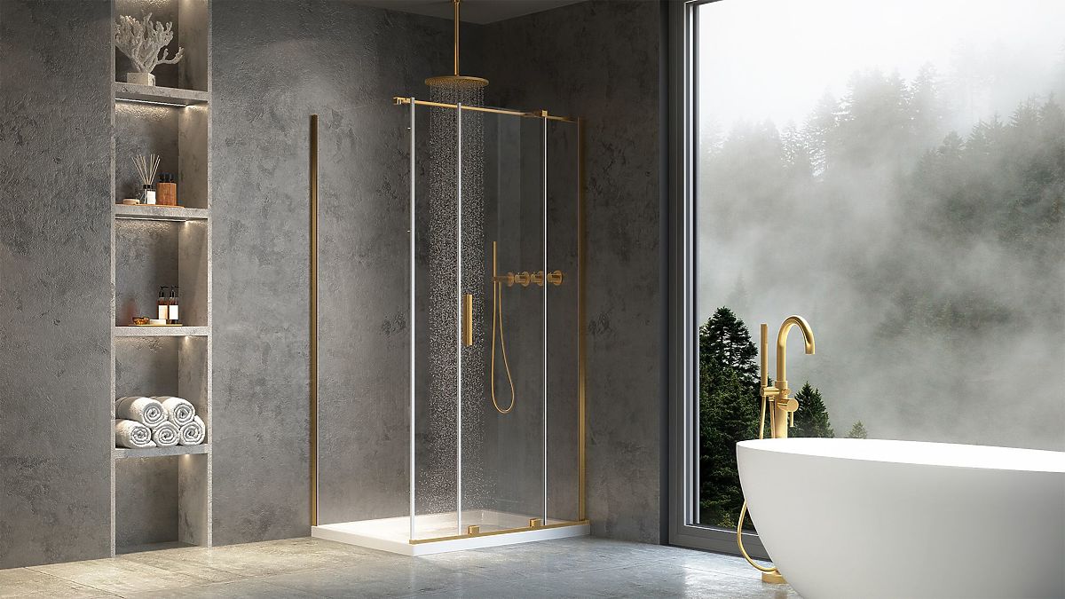 Montana shower enclosure with sliding doors and gold accents. .. more