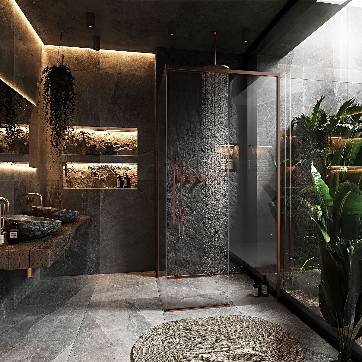 Striking copper shower enclosure with a brushed finish. .. more