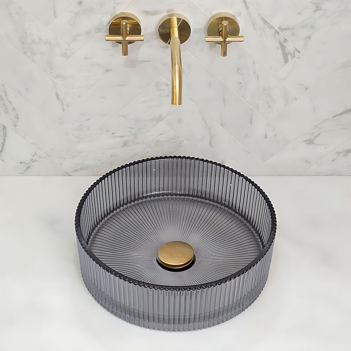 The Ingrid 36 furniture washbasin is designed for those seeking an elegant and unique solution for their bathroom. Made from high-quality glass, it captivates with its grooved surface and grey color, adding a unique character and luxurious style to the interior.
