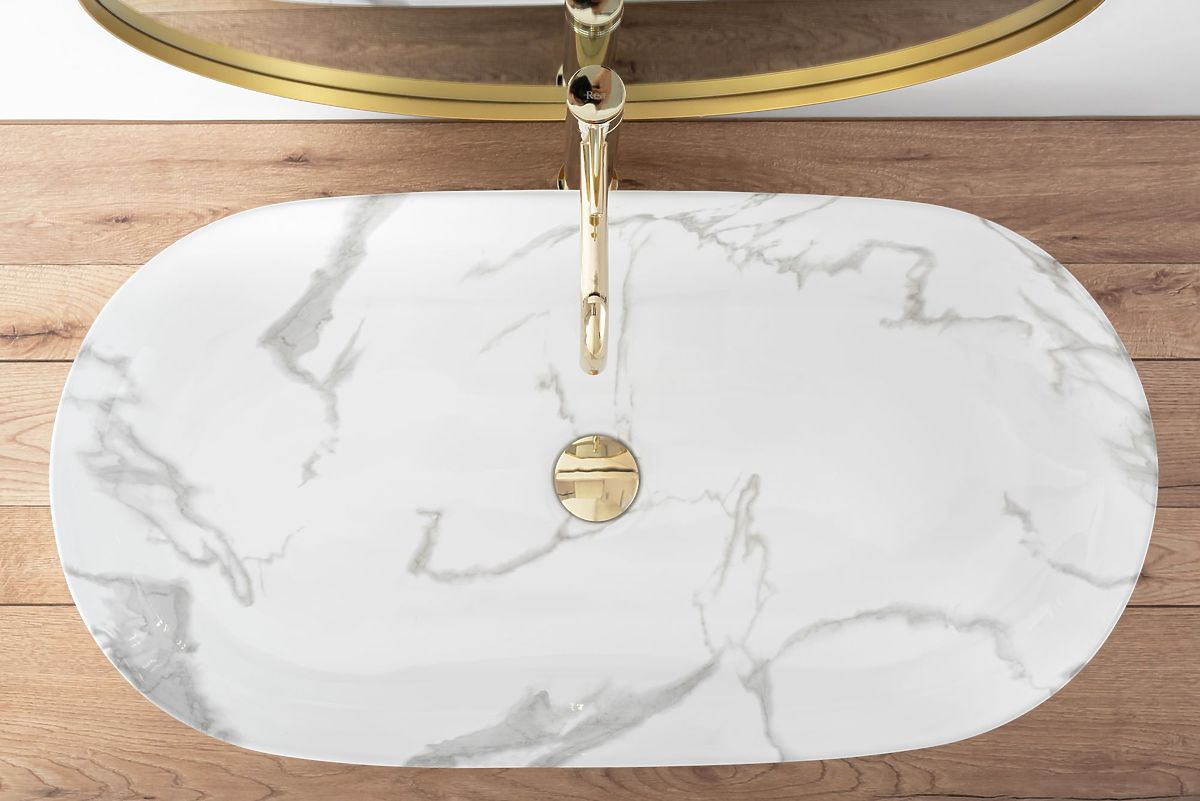 Introducing a modern, unique washbasin with a stone pattern and an unusual shape. The Cleo washbasin will bring elegance to your bathroom, becoming either a standout feature or a subtle accessory. If you choose the shine of this noble color, the final effect will surely gain lightness and originality.