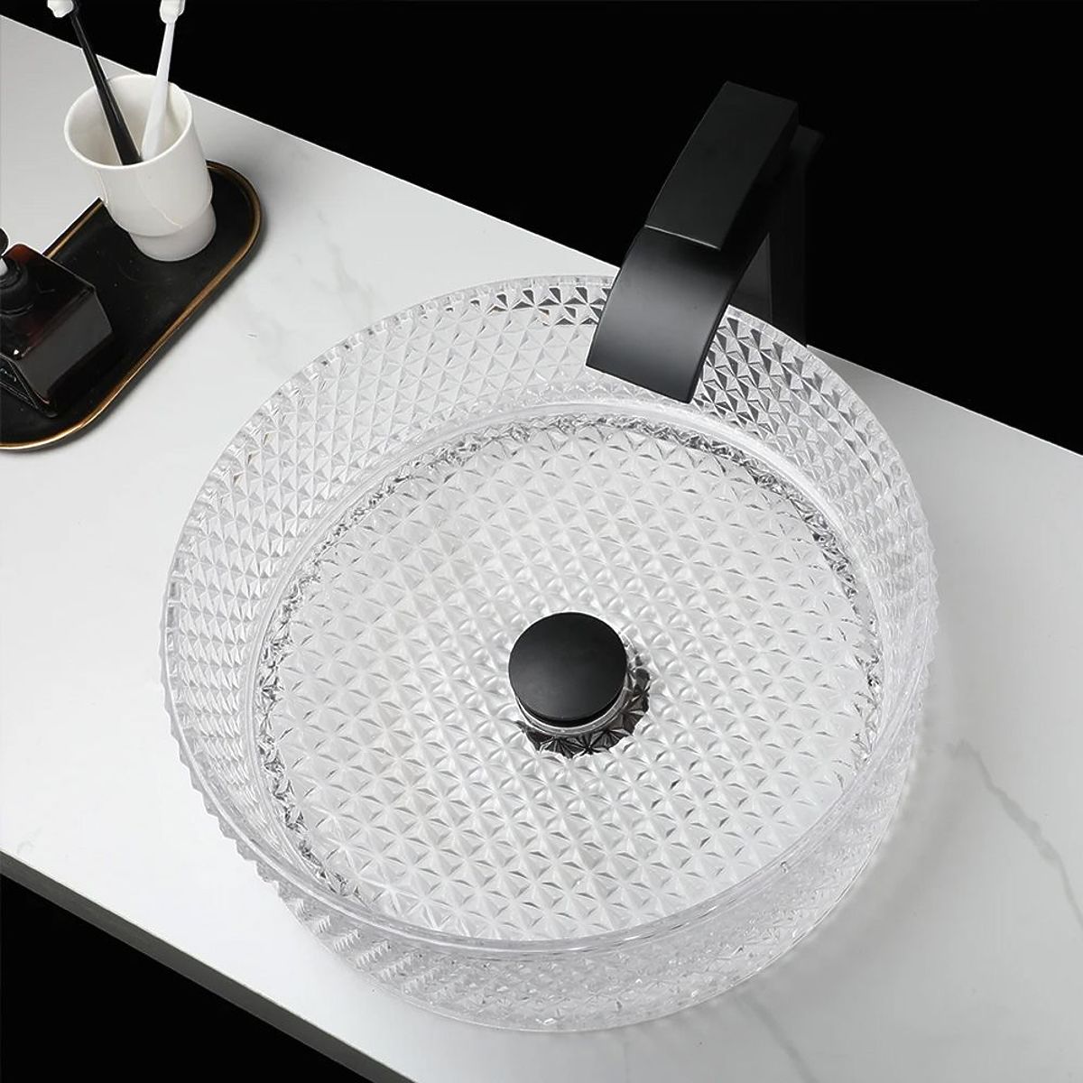 An interesting visual effect is highlighted by light reflecting off the crystals. The glass washbasin with a crystal surface undoubtedly features an intriguing pattern and design.