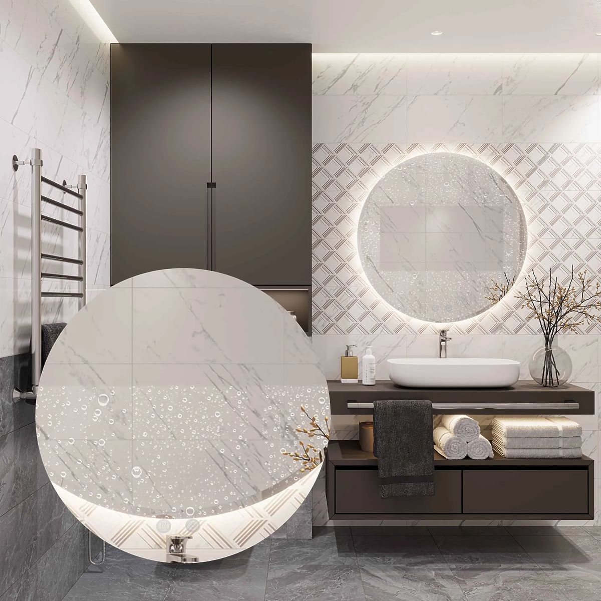 The round mirror with LED lighting is the perfect choice for those who value convenience and modern design. Made from the highest quality materials, it looks great and is very durable. It offers three touch-changeable LED light colors – warm, neutral, and cool, and a heating function that prevents the surface from fogging. The touch switch located on the mirror surface is backlit in blue when the function is activated. The white power cable is 110 cm long.