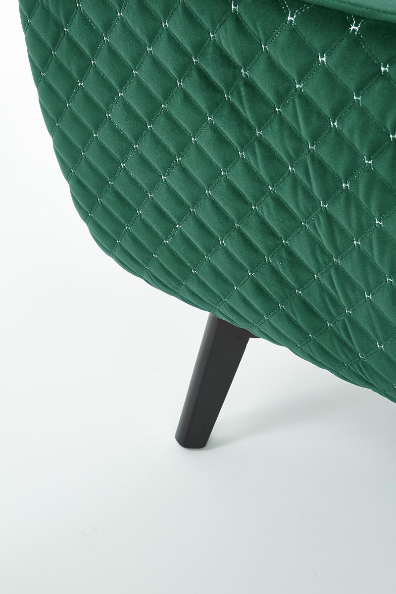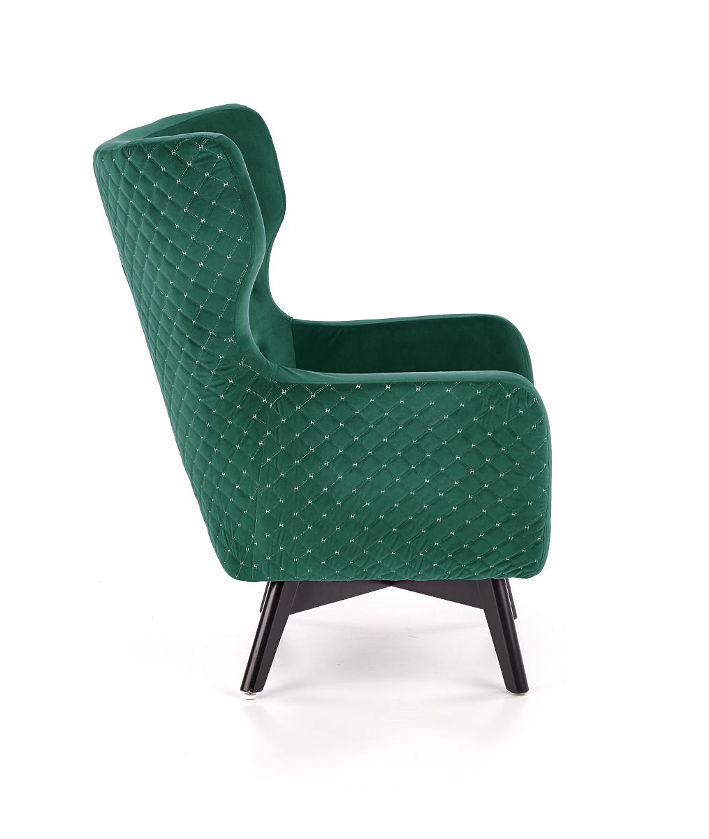 Relaxation armchair with dark green upholstery and black legs. .. more