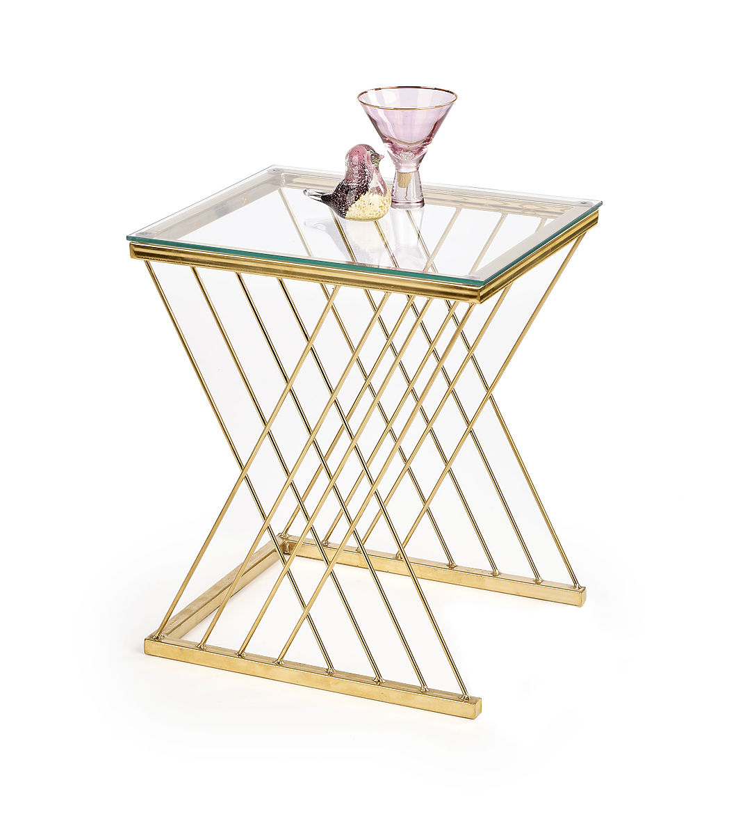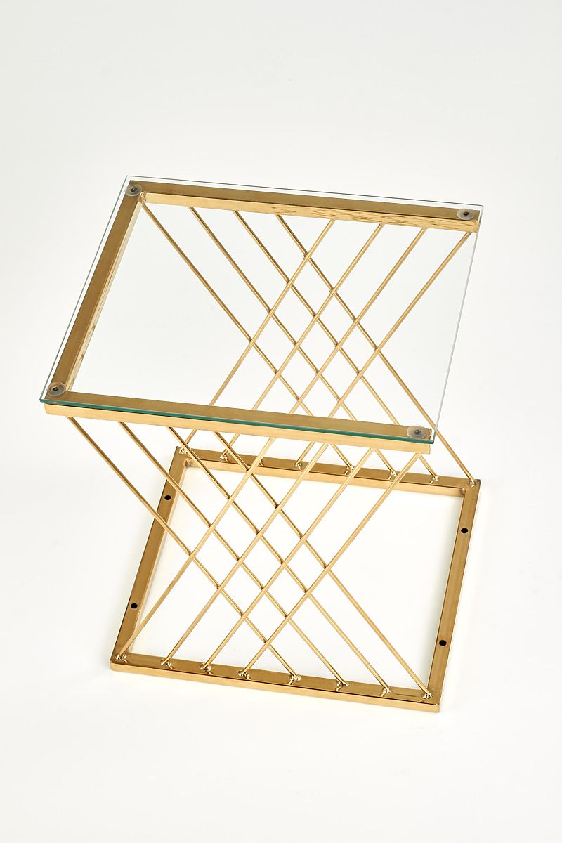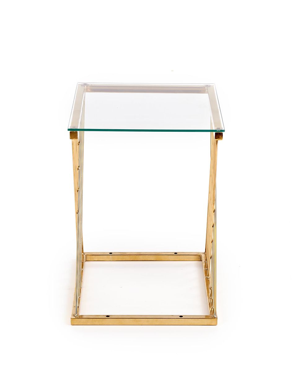 The uniquely shaped base combined with a transparent glass top gives the table a light and elegant appearance that catches the eye at first glance. The combination of chrome steel in a gold finish and glass creates a luxurious impression and beautifully complements modern and glamour interiors.