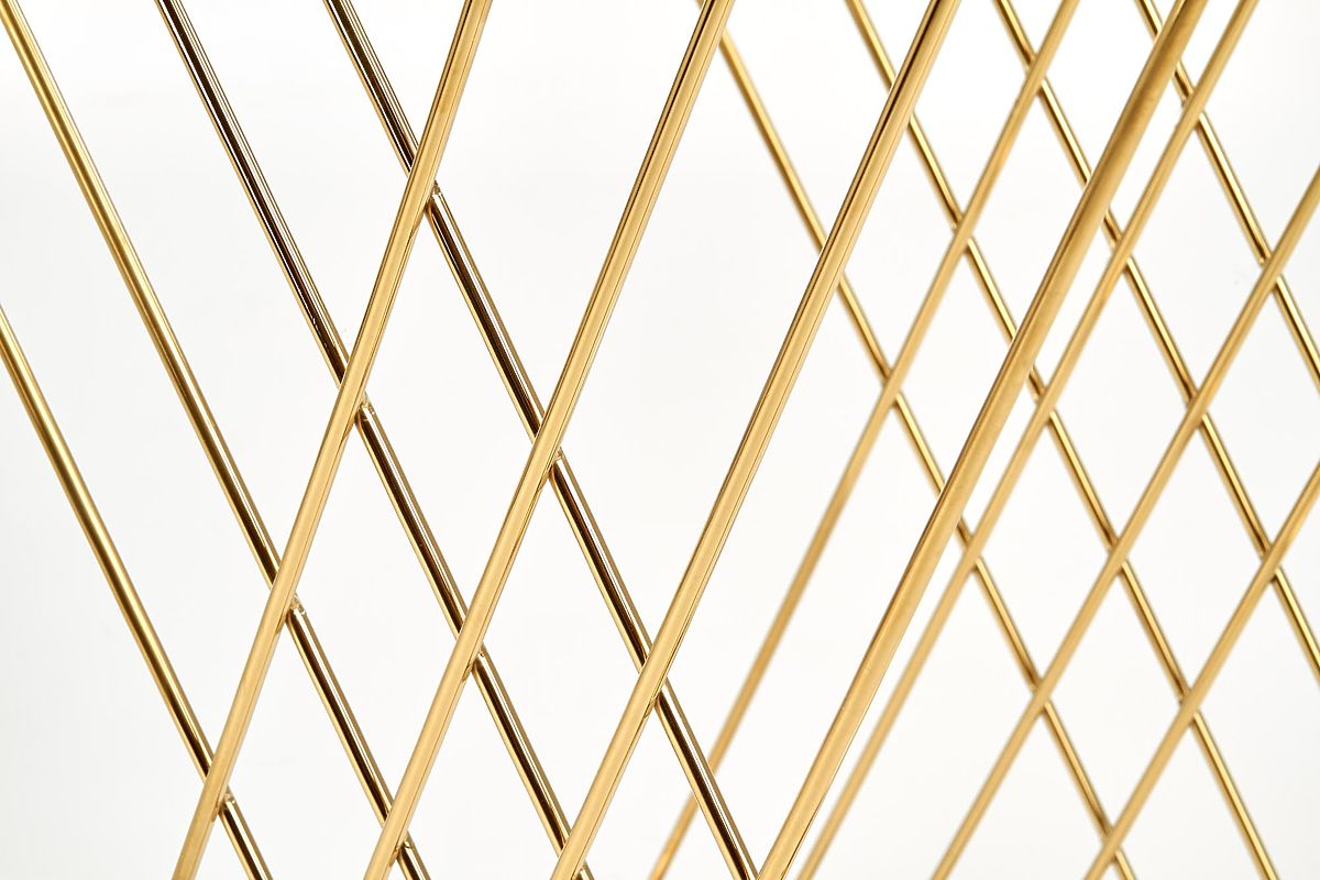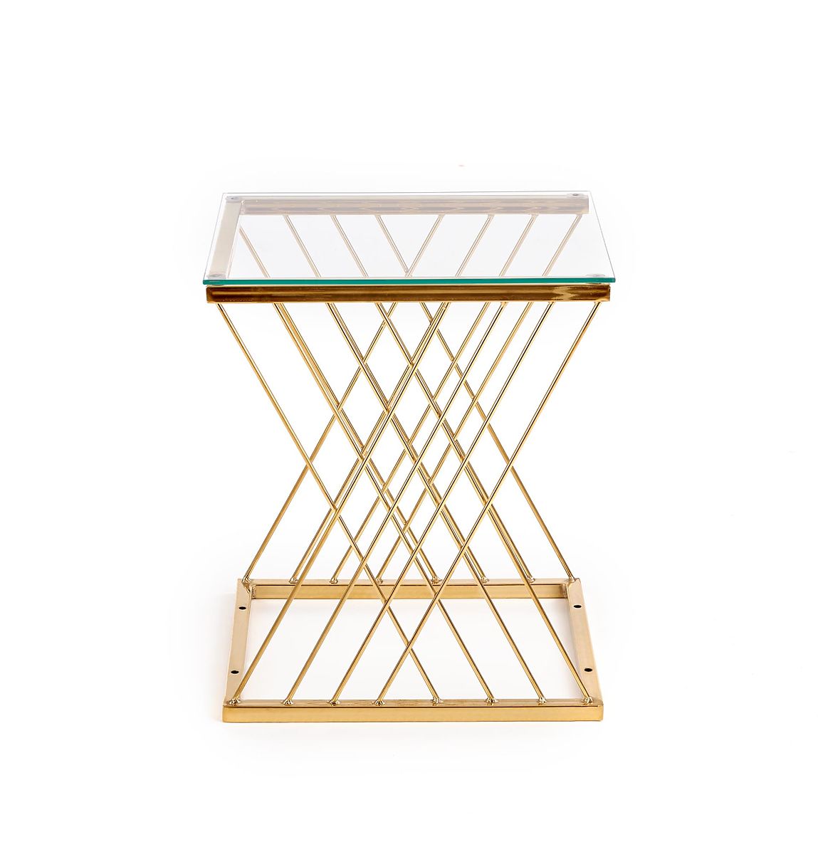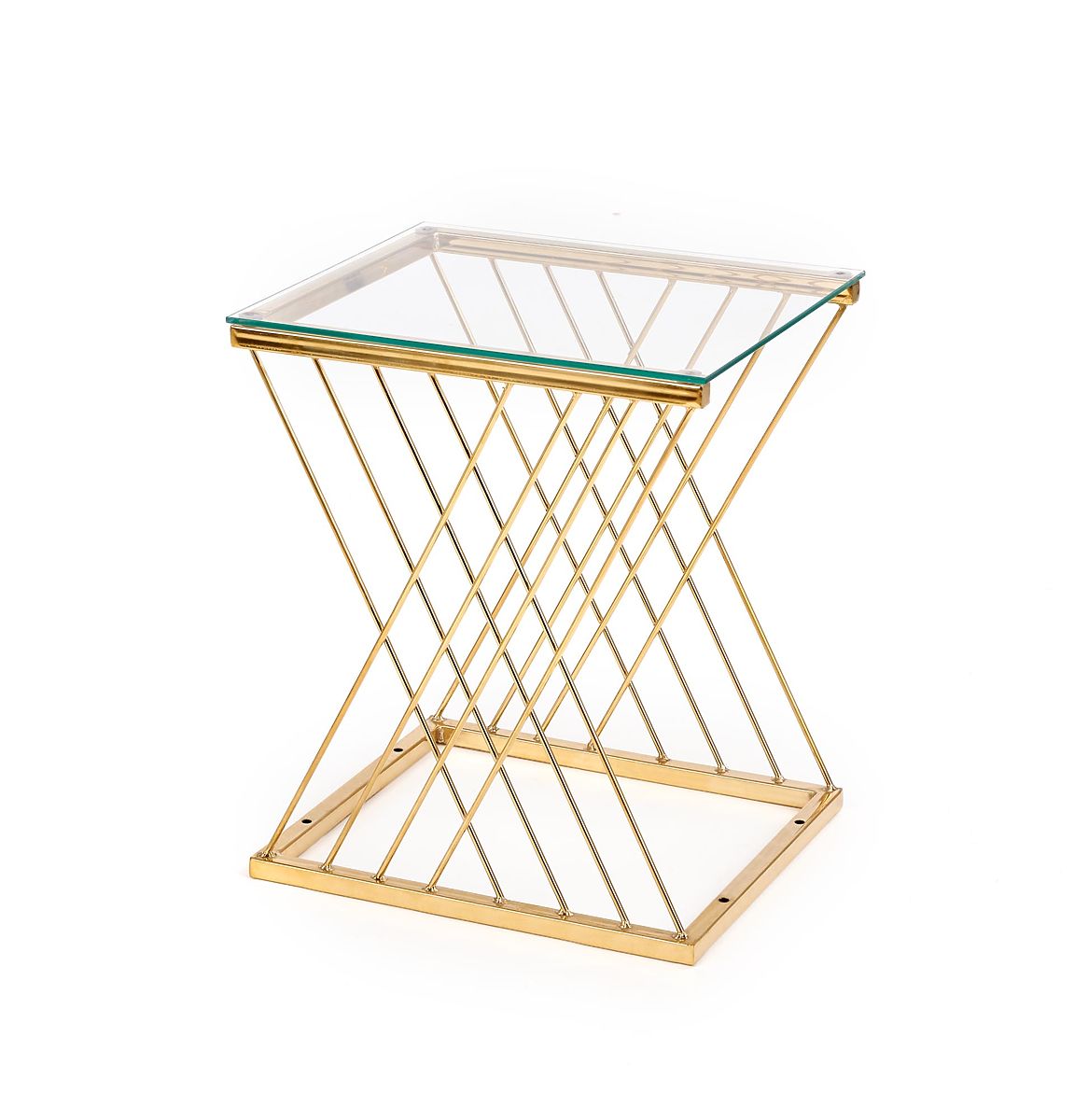 The uniquely shaped base combined with a transparent glass top gives the table a light and elegant appearance that catches the eye at first glance. The combination of chrome steel in a gold finish and glass creates a luxurious impression and beautifully complements modern and glamour interiors.