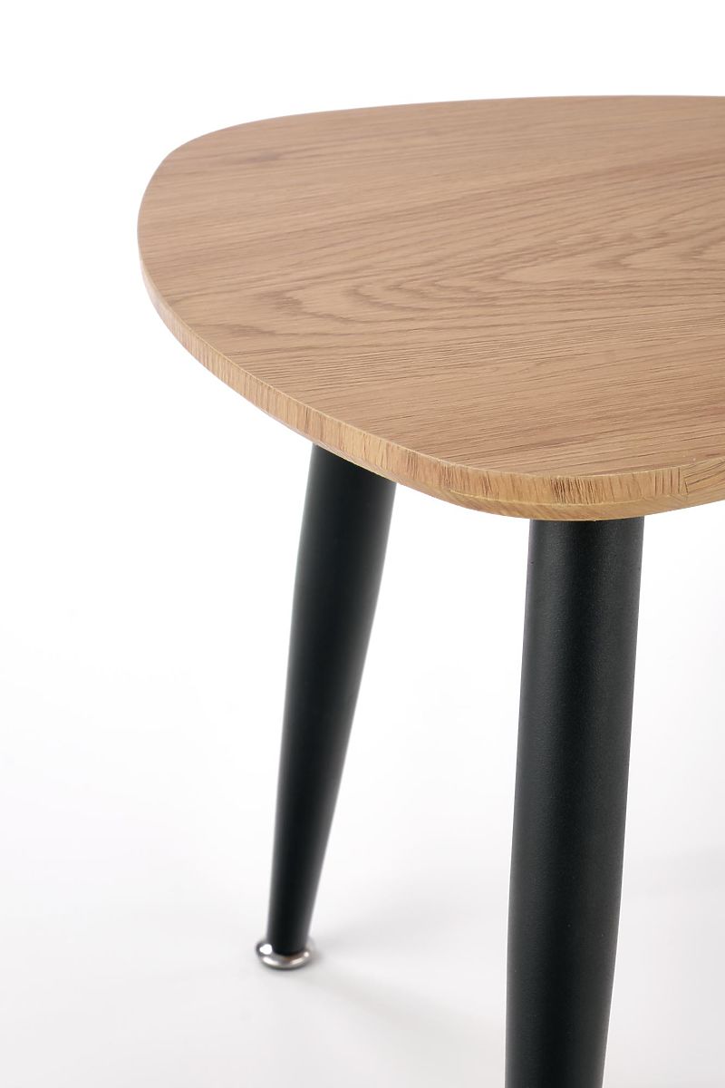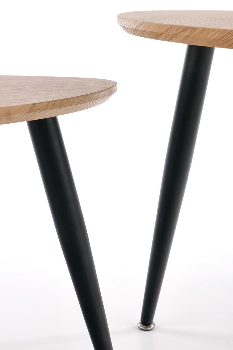 Stability is ensured by three steel legs with a black powder coating, which gently taper downwards, giving the tables a light and modern appearance. The oval tops made of veneered MDF with visible natural grain emphasize the timeless character of the entire set.
