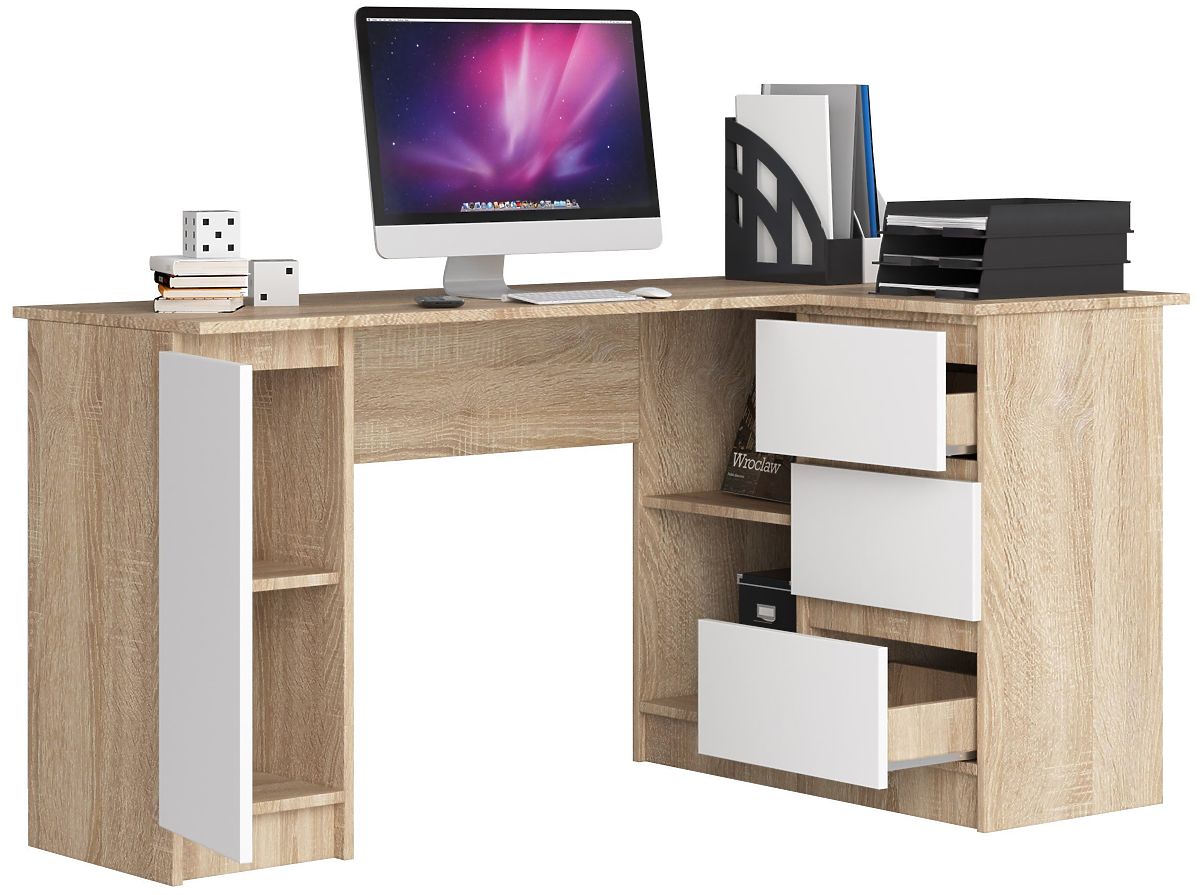 The corner desk B20 in the unique color of Sonoma oak is suitable for a traditional interior. The product is enhanced with white fronts for the drawer and shelf doors and is designed for corner use. It has an optimal height of 77 cm, allowing the workspace to be adjusted to individual needs. The small size and low weight of the furniture allow for assembly in any location. The desk is made of high-quality laminated board from Kronospan. It features practical shelves and drawers that facilitate the storage of larger accessories. Additionally, the drawer systems are equipped with metal roller slides for easy opening and closing. For better edge protection, ABS edging is used to prevent mechanical damage. The desk is delivered flat-packed for self-assembly. The package also includes a practical user manual and a 2-year manufacturer's warranty, which protects the purchased furniture.