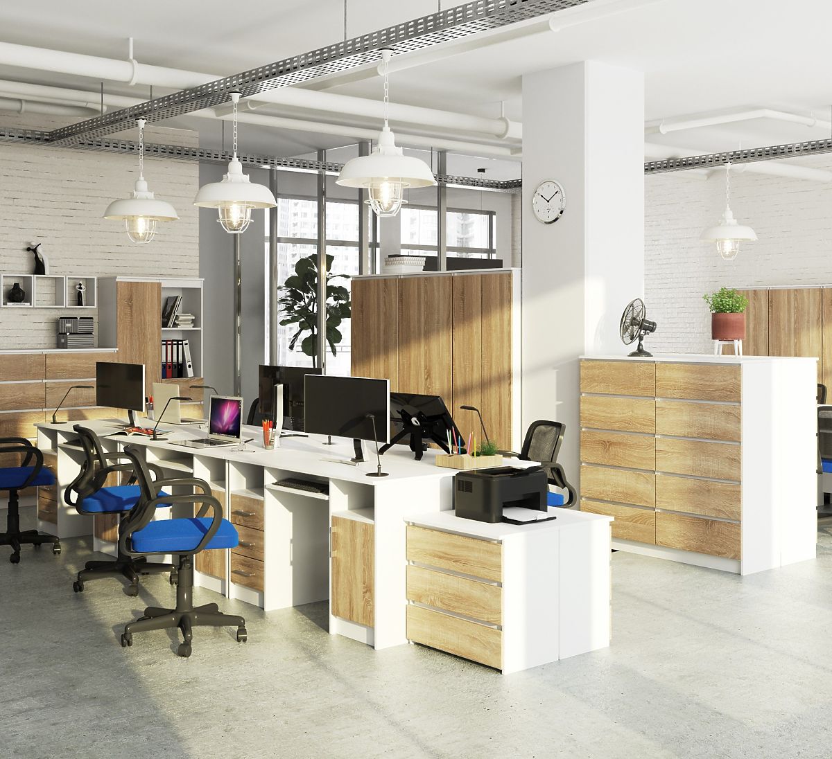The ANA desk is designed with offices and workspaces in mind. It also works very well as a student desk. The classic color combination of white and sonoma allows for easy adaptation to any interior. The large surface of the desk allows for flexible monitor placement. The keyboard can be placed on the pull-out shelf under the desk. The desk offers plenty of space for organization, with open shelves, drawers, and a cabinet with a shelf. The entire construction is made from laminated board resistant to abrasion.