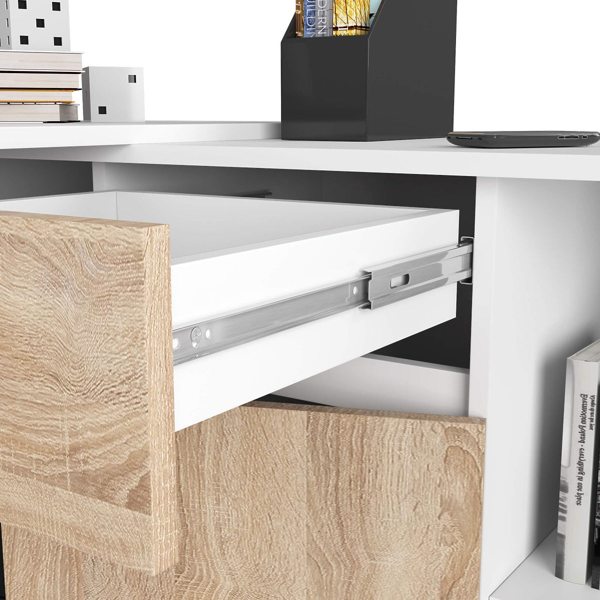 Innovative solution. The desk can be combined with the commode to easily create a corner desk. The option to purchase the commode and desk separately is another feature of our furniture. Versatile furniture, right or left-sided, simply place the commode on the other side of the desk.