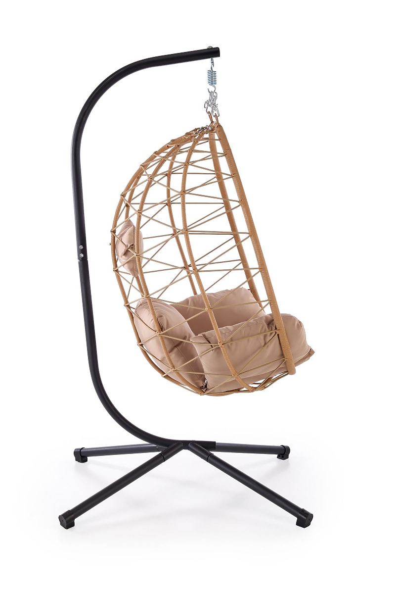 The hanging chair Snake is a stylish relaxation seat designed for one person, creating an ideal spot for rest in the garden, on the terrace, or balcony. Its embracing basket shape provides a sense of privacy and security, while the gentle rocking contributes to overall relaxation and release. The ergonomically shaped basket with a high backrest ensures comfortable seating for reading, conversations, or a short rest. The chair comes with soft cushions that support the seat and back, significantly enhancing comfort during use. Stability is ensured by a freestanding steel frame with a powder coating, eliminating the need to hang the chair from the ceiling. This allows for easy relocation according to the current needs of the relaxation zone. The weight of the frame contributes to safe and stable use. The chair's basket is made from durable eco-rattan, which is airy, sturdy, and suitable for outdoor use. Metal elements ensure the long life and strength of the entire structure, while the textile cushions add a cozy character to the chair.