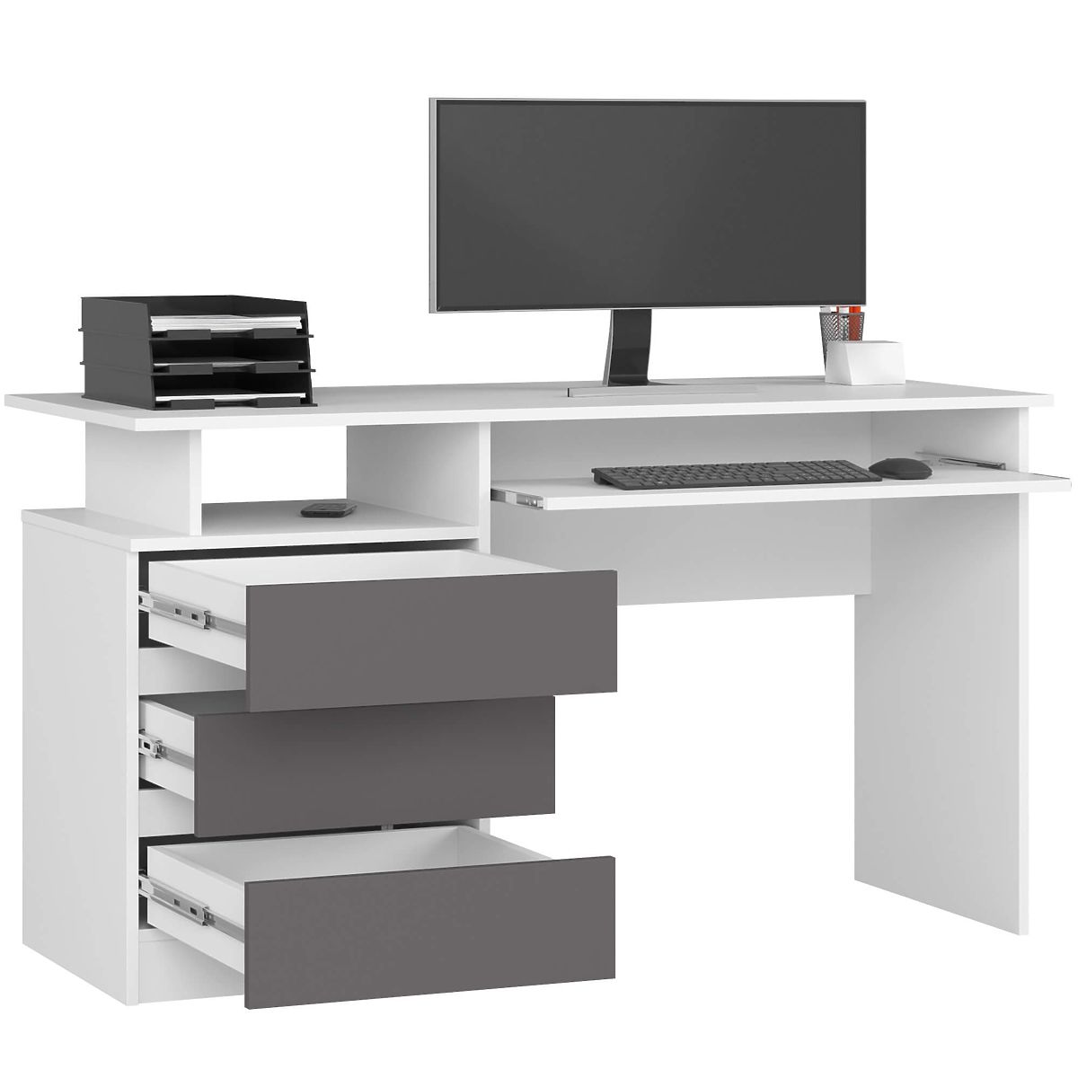 Writing desk with white body and graphite gray fronts. .. more