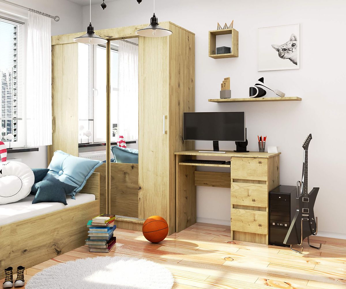 The writing desk made of laminated board is a product characterized by high abrasion resistance, ensuring it remains in perfect condition for a long time. Its universal appearance ensures it will fit perfectly into any room. The furniture is equipped with a board, a sliding shelf, and three spacious drawers that can be arranged according to individual needs.