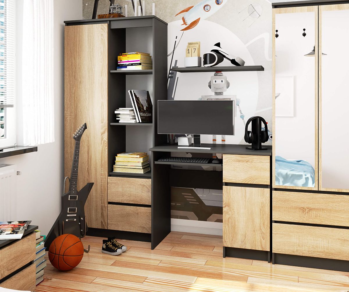 The freestanding PIKSEL 90 cm desk in GRAPHITE GRAY/SONOMA OAK colors is an ideal solution for small interiors. It serves very well as a school or computer desk. Its ergonomic design ensures comfort during use. The desk is equipped with a pull-out keyboard shelf, a practical side drawer, and a cabinet with a shelf where binders and books can stand freely. The desk is made of a pleasant-to-touch and easy-to-maintain matte board covered with a durable laminate layer. The whole is complemented by practical silver-colored handles.