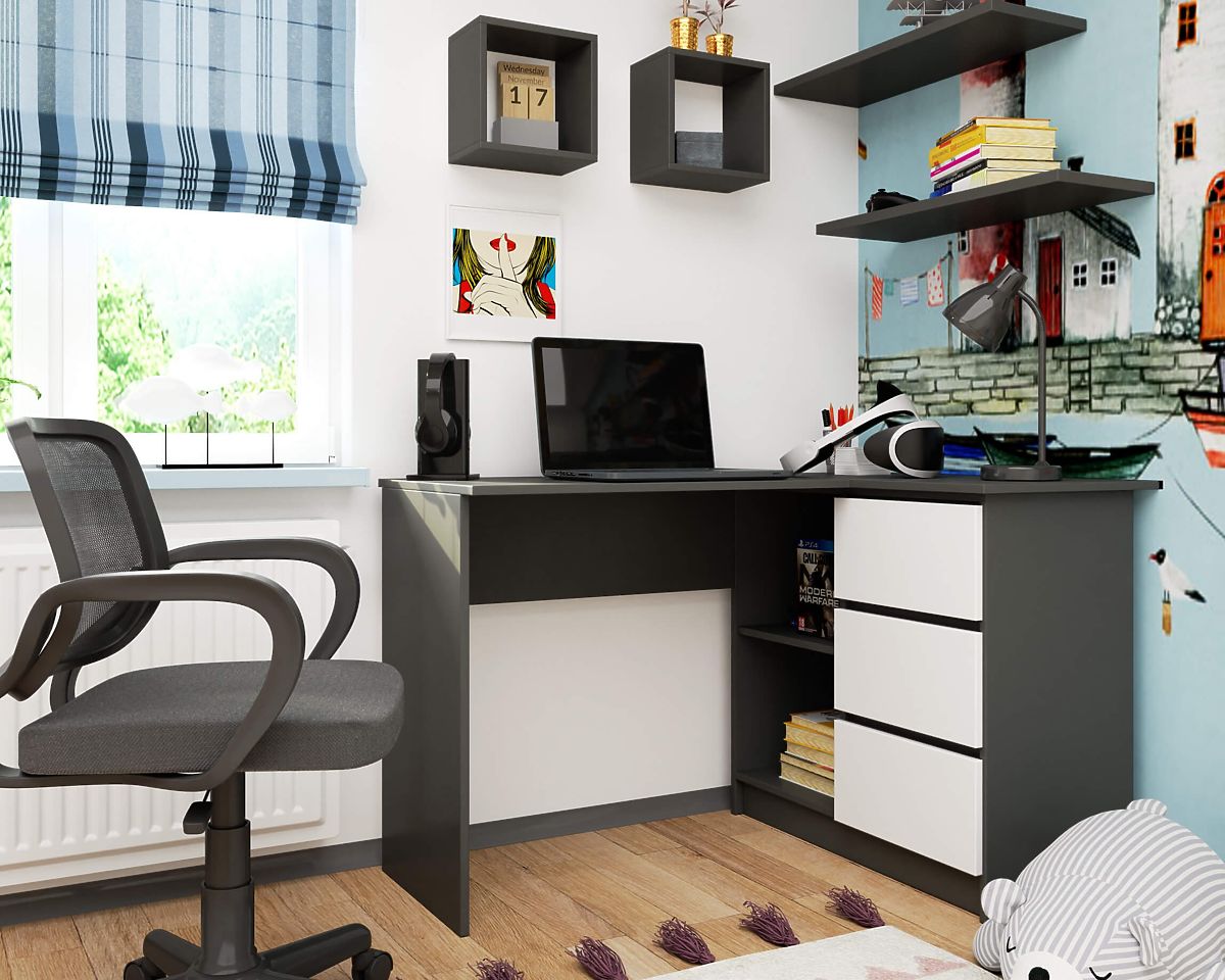 Corner desks are increasingly seen in homes, apartments, and offices. They are not only fashionable but also functional. People looking for furniture in a gray shade with white fronts can choose the B16 corner desk with a width of 124 cm. It is perfect for study or work duties while maintaining a modern look. It includes shelves and drawers for storing documents, books, office supplies, and much more. The furniture is characterized by durability. It is designed for self-assembly, which is not difficult as instructions are included with every order.