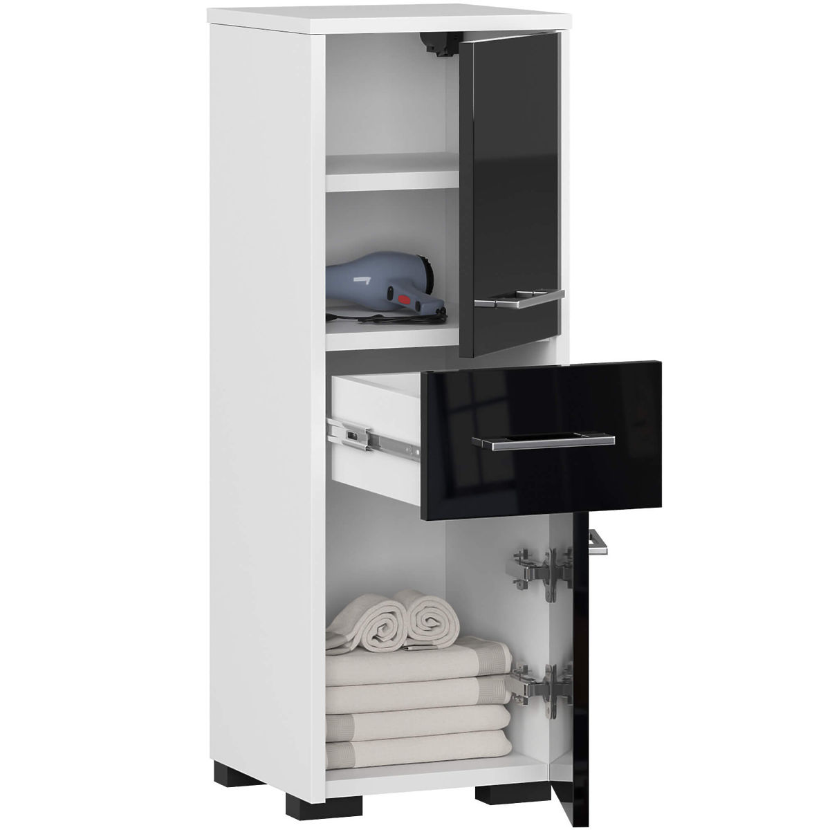 Compact bathroom cabinet with black gloss finish and multiple storage options. .. more