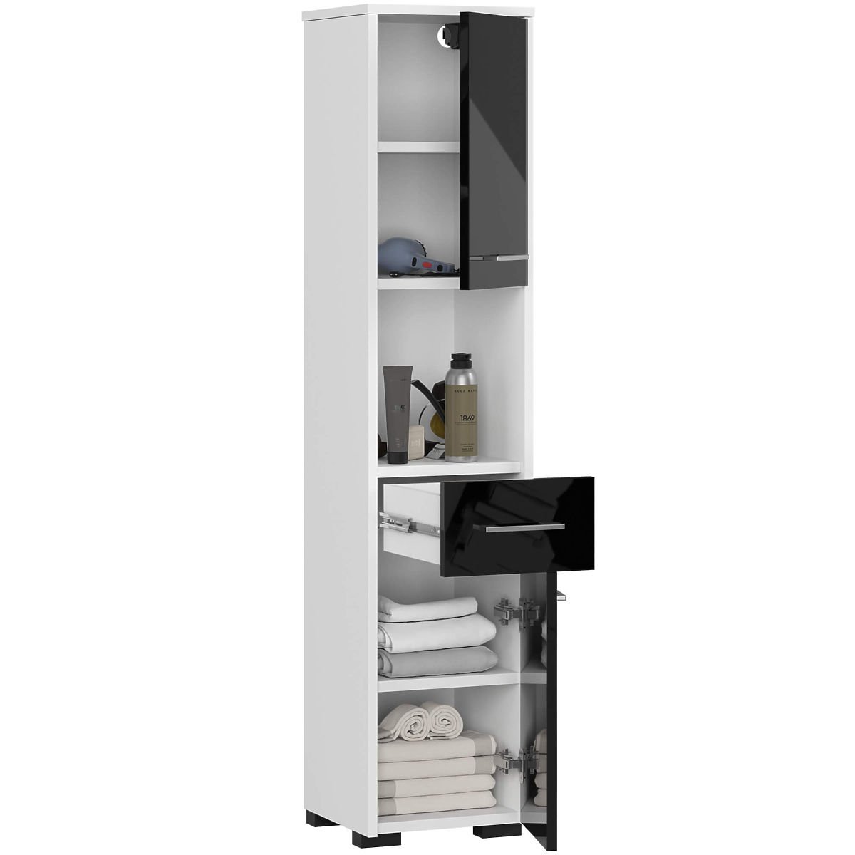 Bathroom shelves are functional furniture that help maintain order in the bathroom. Inside, you can store towels, cosmetics, and other personal hygiene accessories. Shelves can also look stylish. An example is the bathroom shelf FIN 2D 1SZ 1W, which attracts attention with its color scheme - a combination of white with black gloss. The whole is complemented by silver handles on the doors. The furniture consists of a shelf, a drawer, and two cabinets, providing plenty of free space for use. It is also characterized by durability and solid workmanship.