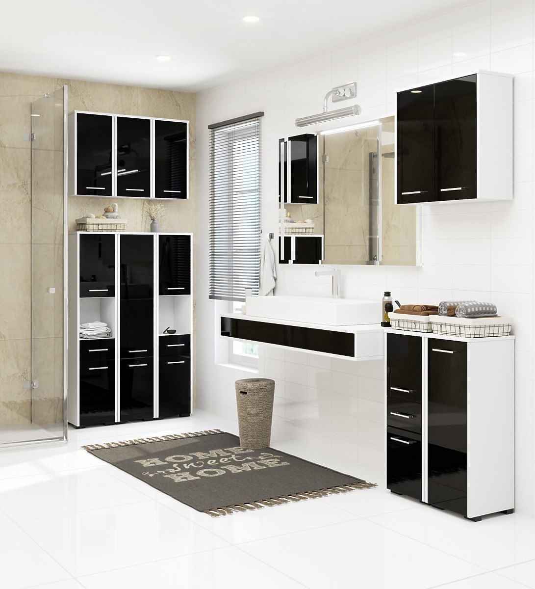 BATHROOM CABINET FIN 2 DOORS WHITE / BLACK GLOSS Made from 16mm abrasion-resistant laminated board.